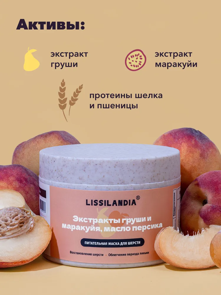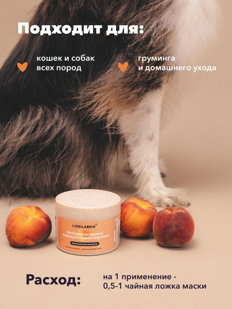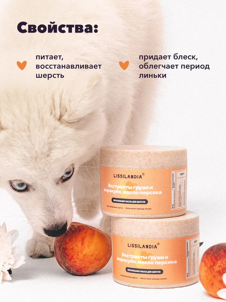 Питательная маска с экстрактами груши и маракуйи, маслом персика,ши и авокадо, протеинами шелка и пшеницы для длинной и средней шерсти животных предназначена для ухода, восстановления, придания здорового блеска, облегчения расчесывания и облегчения периода линьки.Экстракт груши увлажняет, тонизирует и укрепляет кожу и шерстный покров, облегчая период линьки, экстракт маракуйи восстанавливает и питает, протеины шелка и пшеницы способствуют росту и укрепляют.В состав маски входят силикон, пантенол и каприлик триглицериды, они обладают эффективными кондиционирующими и регенерирующими свойствами, облегчают расчесывание, обволакивают и защищают шерсть.Подходит для животных с 2,5 месяцев.Применение: небольшое количество маски нанести на увлажненную шерсть, помассировать, оставить на 5-10 минут, обильно смыть водой.Подходит для частого применения.