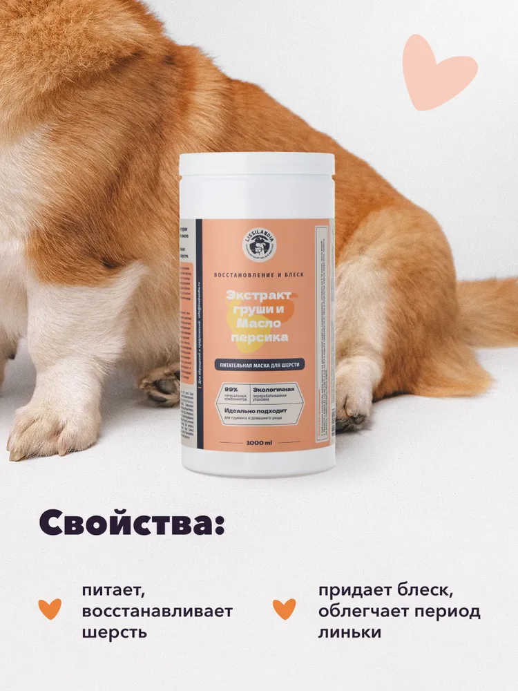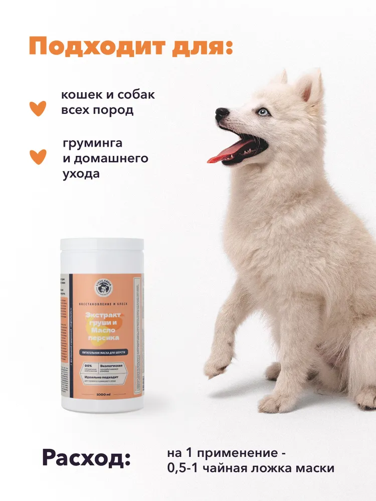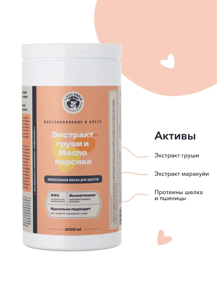 Питательная маска с экстрактами груши и маракуйи, маслом персика,ши и авокадо, протеинами шелка и пшеницы для длинной и средней шерсти животных предназначена для ухода, восстановления, придания здорового блеска, облегчения расчесывания и облегчения периода линьки.Экстракт груши увлажняет, тонизирует и укрепляет кожу и шерстный покров, облегчая период линьки, экстракт маракуйи восстанавливает и питает, протеины шелка и пшеницы способствуют росту и укрепляют.В состав маски входят силикон, пантенол и каприлик триглицериды, они обладают эффективными кондиционирующими и регенерирующими свойствами, облегчают расчесывание, обволакивают и защищают шерсть. Подходит для животных с 2,5 месяцев.Применение: небольшое количество маски нанести на увлажненную шерсть, помассировать, оставить на 5-10 минут, обильно смыть водой.Подходит для частого применения.
