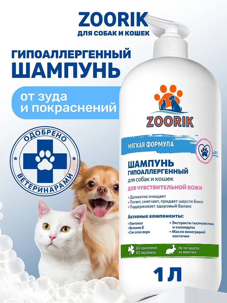 Идеальный выбор для питомцев с чувствительной кожей и склонностью к аллергическим реакциям. Гипоаллергенный шампунь ZOORIK бережно ухаживает за шерстью и кожным покровом, не вызывая зуда, шелушения или покраснений.Нежная моющая основа мягко очищает, не пересушивая. Сок алоэ вера глубоко увлажняет, успокаивает и защищает от внешнего раздражения. Масло виноградной косточки придаёт гладкость и делает шерсть бархатной на ощупь. Экстракт календулы ускоряет восстановление кожи, снимает воспаления и поддерживает естественный баланс.Тысячелистник укрепляет структуру шерсти, способствует росту и предотвращает ломкость. Витамин Е усиливает защитные функции, а пантенол помогает сохранить эластичность, придавая здоровый блеск. Кондиционирующий компонент облегчает расчёсывание, предотвращает образование колтунов и делает шерсть послушной.Шампунь идеально подходит для регулярного ухода за собаками и кошками всех пород. После применения кожа остаётся спокойной, а шерсть выглядит ухоженной, блестящей и мягкой.СПОСОБ ПРИМЕНЕНИЯ: Обильно смочить шерсть теплой водой. Развести шампунь с теплой водой в пропорции 1/3, с помощью губки равномерно нанести на влажную шерсть, слегка втирая до образования пены. Тщательно смыть теплой проточной водой. Высушить питомца полотенцем и расчесать. Рекомендуем использовать после мытья шампунем: кондиционер или маску.E-COSMETIC – официальный поставщик ZOORIK.