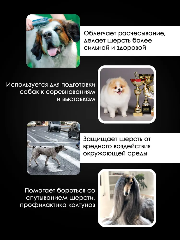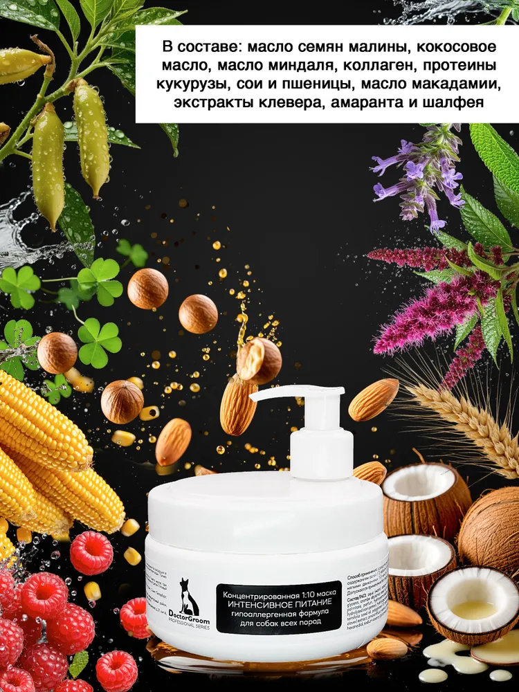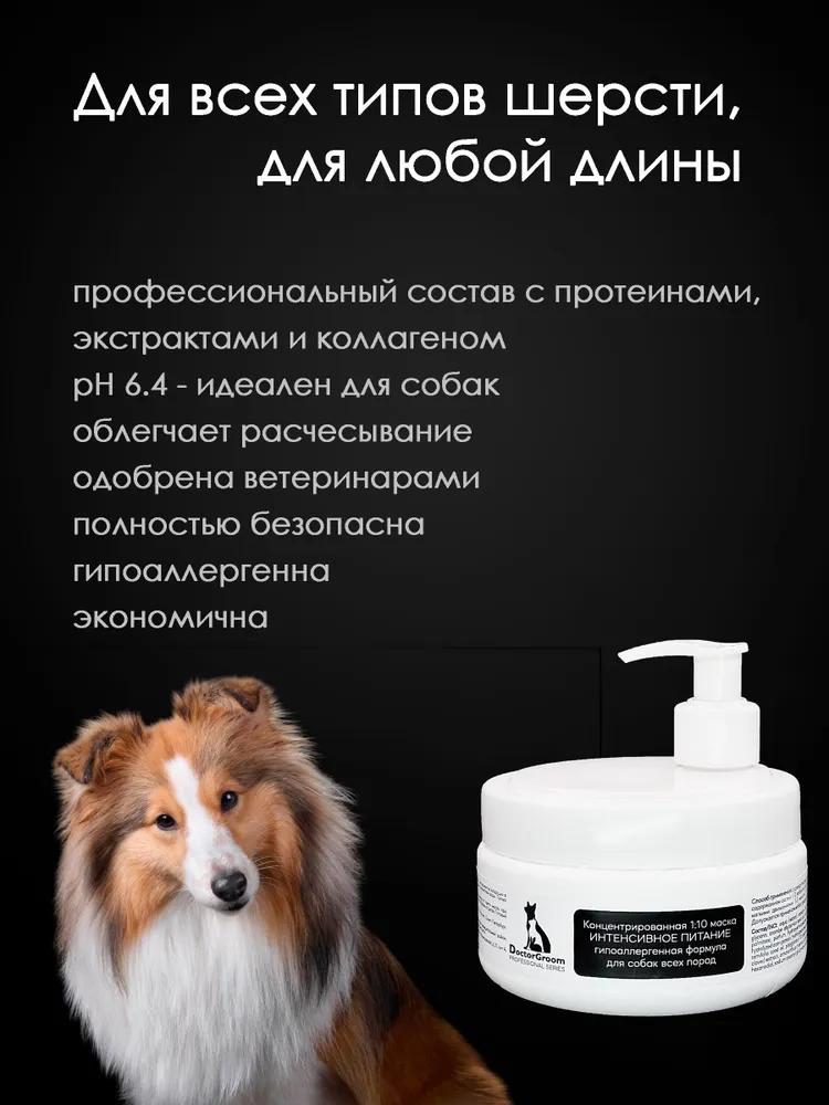 Уделите вашему четвероногому другу максимум заботы с маской для шерсти от Doctor Groom!Маска ИНТЕНСИВНОЕ ПИТАНИЕ подходит для всех пород и типов шерсти, обеспечивая легкое расчесывание и убирая колтуны, что делает уход за вашим любимцем проще и эффективнее. Гипоаллергенная формула предназначена для глубокой увлажняющей терапии, бережно заботясь о коже и шерсти вашего собаки. Практически без запаха, не ароматизирует шерсть, а значит, не доставляет вашему питомцу дискомфорт резким чужим ароматом. Сбалансированный pH соответствует pH кожи собак, но не подходит для кошек. Подходит для щенков с 3 месяцев.Использование маски позволяет добиться не только мягкости и шелковистости шерсти, но и придает ей здоровый блеск, что особенно важно для активных питомцев. Применение данного средства помогает поддерживать шерсть в отличном состоянии, предотвращая спутывание и сохраняя ее внешний вид.Удобная баночка с дозатором обеспечивает легкость в применении. Делает процесс ухода за собакой приятным и комфортным как для вас, так и для вашего четвероногого друга.Маска для шерсти собак подходит для частого применения. Для достижения максимального эффекта используйте с шампунями Doctor Groom. Бальзам для шерсти обеспечивает профессиональный уход на дому — шерсть становится более плотной и здоровой, шелковистой и рассыпчатой, увеличивается объем, прекращается выпадение и активизируется рост волос. Маска-концентрат прекрасно смывается, безопасно при вылизывании.Doctor Groom — это профессиональная косметика для собак. Косметика для животных ТОЛЬКО ДЛЯ НАРУЖНОГО ПРИМЕНЕНИЯ.Способ применения: разведите средство в теплой воде в пропорции 1:10 (для жесткой воды и воды с большим содержанием солей 1:7), взбейте губкой или блендером, нанесите на чистую мокрую шерсть. Помассируйте мягкими движениями 1-3 минуты. Оставьте для воздействия на 8-10 минут, тщательно смойте водой. Допускается применение без предварительного разведения водой.
