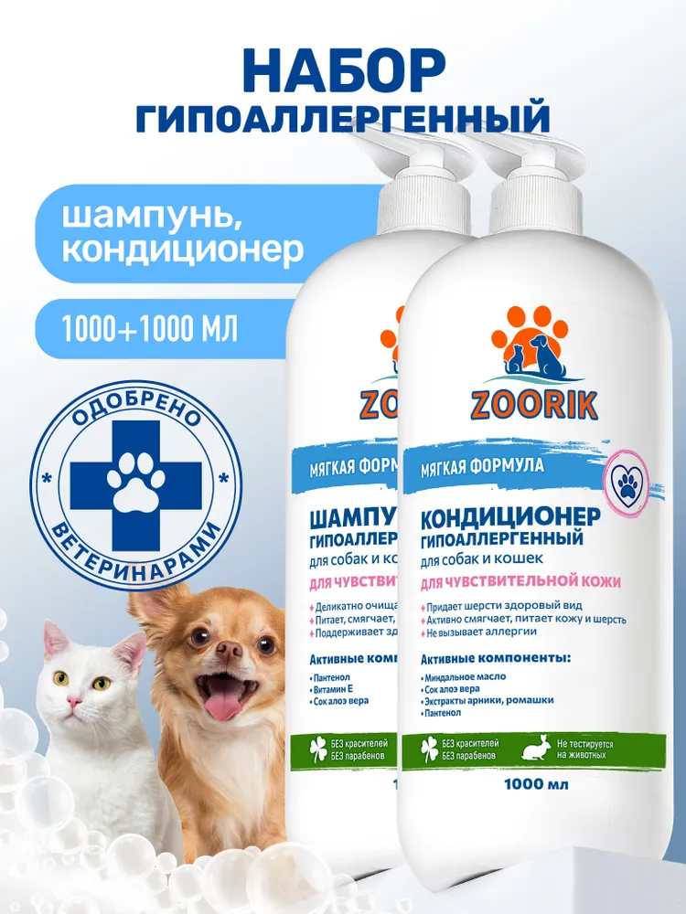 Комплексный уход для чувствительной кожи и шерсти — идеальное решение для питомцев, склонных к раздражениям и зуду. Гипоаллергенный набор ZOORIK помогает избежать неприятных реакций, обеспечивая мягкое очищение и интенсивное восстановление без пересушивания или покраснений.Шампунь разработан с заботой о деликатной коже. Он бережно удаляет загрязнения, не нарушая естественного баланса. В его составе — растительный глицерин, который увлажняет и предотвращает стянутость, масло виноградной косточки питает и укрепляет, а экстракты календулы и тысячелистника успокаивают и защищают. Пантенол и витамин Е помогают восстановить естественный барьер и поддерживают здоровье покровов.Кондиционер дополняет действие, делая шерсть гладкой, шелковистой и блестящей. Миндальное масло наполняет волоски питательными компонентами, ромашка и арника устраняют раздражения, сок алоэ смягчает и придаёт ощущение свежести.После применения шерсть легко расчёсывается, меньше спутывается и выглядит ухоженно.СПОСОБ ПРИМЕНЕНИЯ: шампунь: обильно смочить шерсть теплой водой. Развести шампунь с теплой водой в пропорции 1/3, с помощью губки равномерно нанести на влажную шерсть, слегка втирая до образования пены. Тщательно смыть теплой проточной водой.Кондиционер: После мытья шампунем равномерно нанести кондиционер на влажную кожу и шерсть животного, следуя по росту шерсти, помассировать для ускорения впитывания в течение 3-5 минут. Затем ополоснуть теплой водой. Высушить питомца. Противопоказания: индивидуальная непереносимость компонентовE-COSMETIC – официальный поставщик ZOORIK.
