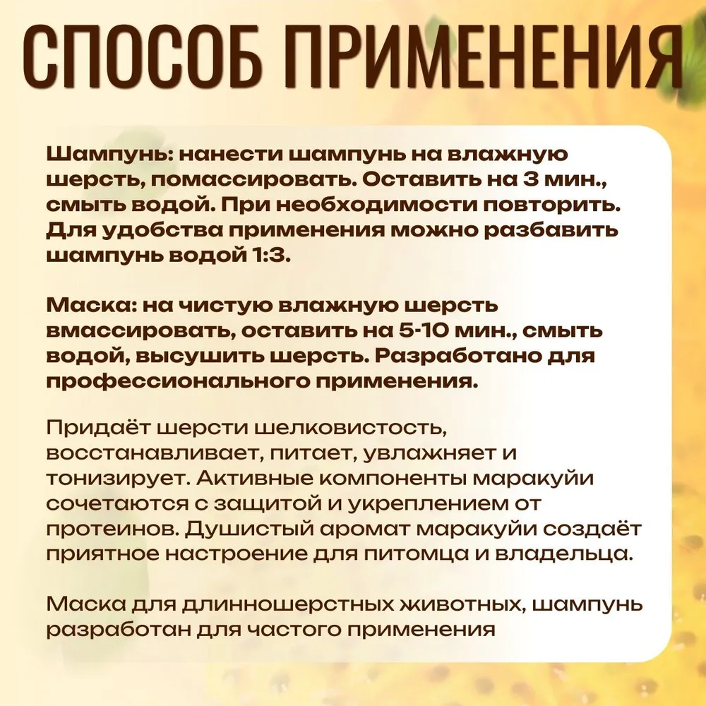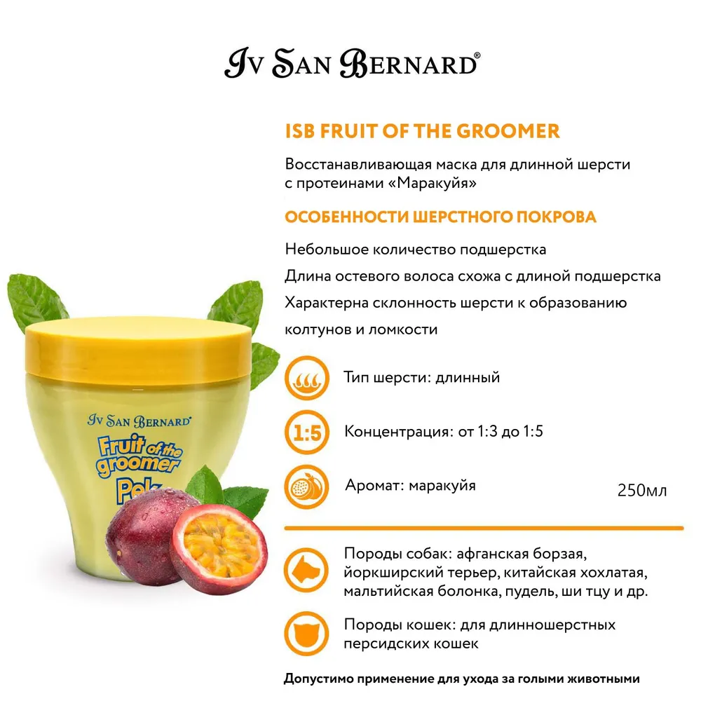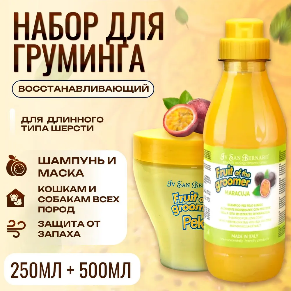 Набор для груминга Шампунь 500 мл + Маска 250 мл. ISB Fruit of the Groomer Maracuja Восстанавливающий для длинной шерсти с протеинами. Iv San Bernard. Ив Сан Бернард