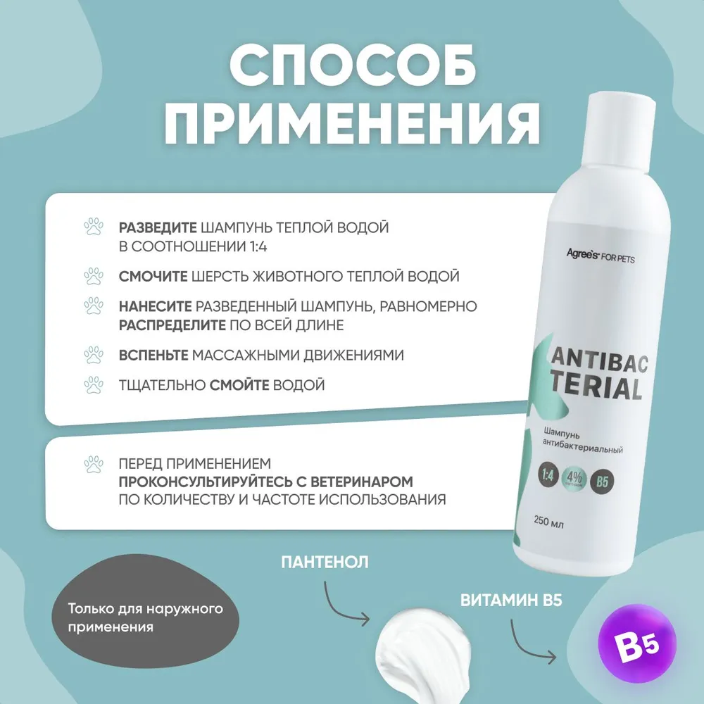 Способ применения:Разведите шампунь теплой (не горячей) водой в соотношении 1:4. Смочите шерсть животного водой, нанесите разведенный шампунь, равномерно распределите по всей длине, вспеньте массажными движениями и очень тщательно смойте водой. Далее наносим кондиционер или маску для глубокого питания шерсти.Рекомендовано для ухода за шерстью и кожей животных для профилактики и лечения кожных заболеваний