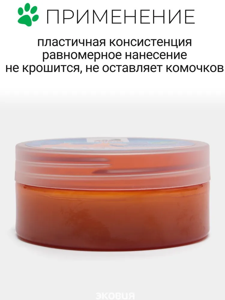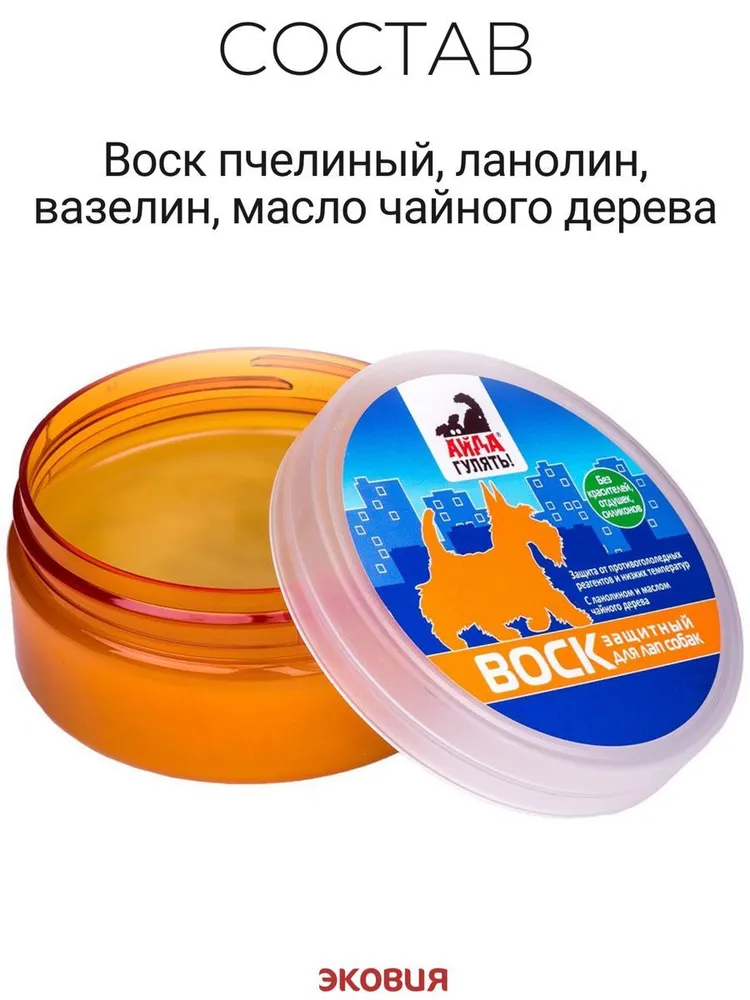 Воск АЙДА ГУЛЯТЬ для эффективной защиты лап собак во время прогулки: защищает от воздействия противогололедных реагентов и нефтепродуктов (бензин, мазут, масло); препятствует обморожению, защищает от воздействия низких температур; уменьшает скольжение лап по льду и на ринге; предотвращает травмирование льдом, снегом, песком, гравием, асфальтом; смягчает кожу подушечек лап. ВАЗЕЛИН - образует на поверхности кожи защитную водонепроницаемую пленку. МАСЛО ЧАЙНОГО ДЕРЕВА - обладает мощным антисептическим и противогрибковым действиями. ПЧЕЛИНЫЙ ВОСК И ЛАНОЛИН - увлажняют, питают и смягчают кожу лап. СПОСОБ ПРИМЕНЕНИЯ: Перед прогулкой приложить лапы к воску. После прогулки вытереть лапы салфеткой. Подходит для груминга и ухода собакам и кошкам.