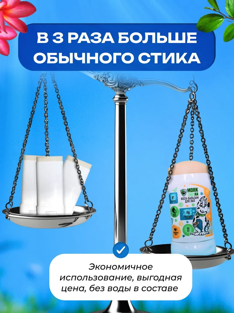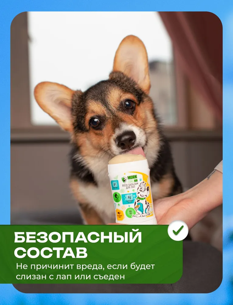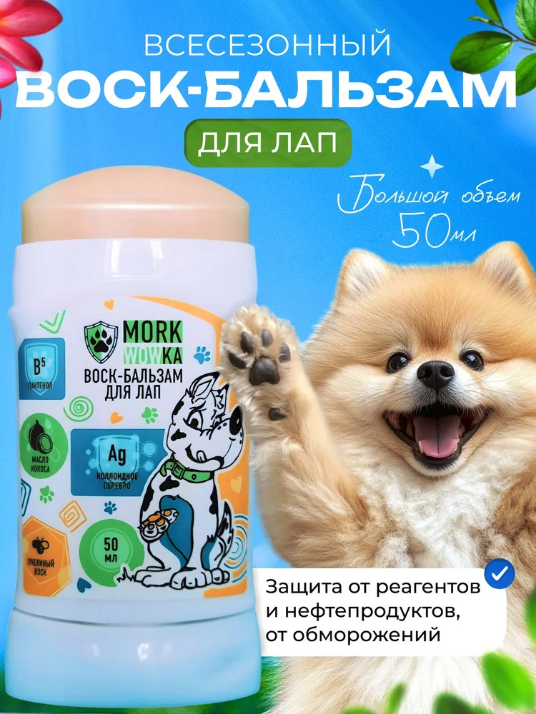 Защитный воск бальзам MorkWOWka (Морковка) для лап собак и кошек, увлажняющий и питательный, ухаживает за лапами питомцев во время прогулки.Образует на поверхности кожи прочную водонепроницаемую пленку, защищающую кожу лап от воздействия бензина, мазута, соли и противогололедных реагентов, а также от мороза, уменьшает скольжение собаки по льду и снижает возможность травмирования подушечек. Препятствует налипанию снега между пальцами лап. Необходимое средство груминга и ухода за вашим питомцем.Активные компоненты:● Коллоидное серебро способствует заживлению кожного покрова при его поражении, блокирует размножение бактерий, вирусов и грибков, повышает защитные свойства● Пчелиный воск отвечает за увлажненность кожного покрова, создает на его поверхности тонкую защитную пленку и не дает испаряться влаге, а также защищает от негативных загрязнений извне.● Соевый воск смягчает, питает, увлажняет, образуя на кожном покрове защитную пленку.● Пантенол надолго увлажняет ткани, смягчает, делает эпидермис упругим, напитанным. Кожный покров становится более гладким, грубый роговой слой эпидермиса размягчается, пропадает шелушение.● Вазелин способствует защите от незначительных царапин, трещин, шелушения. Покрывая кожный покров, вазелин препятствует негативному воздействию факторов окружающей среды (ветра, грязи, перепадов температур).● Ланолин способствует смягчению и увлажнению кожи. Он является поверхностно-активной добавкой, обеспечивает кондиционирующий эффект.● Масло кокоса увлажняет, способствует восстановлению кожного покрова и его эластичности.● Подсолнечное масло обладает антиоксидантными свойствами, способствует стимуляции клеток к регенерации, увлажняет, защищает.СПОСОБ ПРИМЕНЕНИЯ: нанесите воск на подушечки лап животных непосредственно перед прогулкой, давая составу подсохнуть в течение 1 минуты. После прогулки смойте остатки воска теплой водой с шампунем или удалите при помощи влажной салфетки.