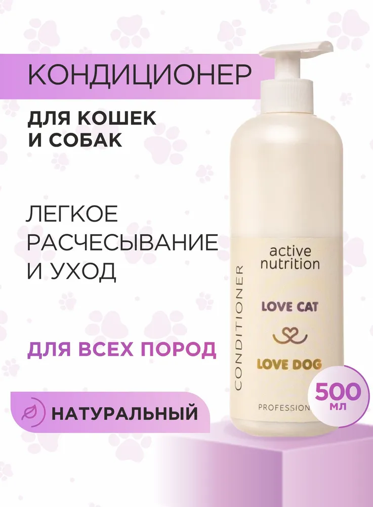 Станьте профессиональным грумером и стилистом для любимого питомца вместе с органической серией по уходу за собаками и кошками LOVE CAT LOVE DOG. Кондиционер для собак и кошек Активное питание помогает шерсти стать блестящей и шелковистой. Разглаживает каждый волосок, чтобы вычесывание питомца было простым и быстрым делом для вас.Мы разработали кондиционер для собак и шампунь для кошек, а также другие уникальные средства для ухода за животными с учетом опыта профессиональных грумеров и заводчиков.Органический кондиционер для собак и кошек заботится не только о шерсти, но и не повреждает кожу ваших рук, в отличие от обычных синтетических средств. Мы за безопасное и приятное купание для всех участников!Кондиционер отлично подходит для ухода за длинношерстными собаками или кошками.Масло репейника обладает питающим, укрепляющим эффектом, оказывает благоприятное действие на структуру волос животного, сокращает фазу линьки.Воск рисовых отрубей защищает шерсть собаки и кошки от обезвоживания, создает защитную пленку, делая шерстку более гладкой и блестящей.Экстракт шелка кондиционирует и улучшает внешний вид шерсти питомца.Масло авокадо способствует увлажнению, повышает эластичность и защищает шерсть животного от вредных воздействий окружающей среды.Даже если ваш любимый хвостик долгое время обходился без мытья, комплекс средств по уходу за собаками и кошками LOVE CAT LOVE DOG поможет выглядеть так, как будто он побывал в дорогом груминг-салоне. Здоровые, ухоженные на профессиональном уровне шерсть и кожа четвероногого друга - без лишних трат и поездок. И всё это в привычных домашних условиях, никаких переживаний и стресса!Рекомендации по уходу:Обработайте засаленные, жирные, особо грязные участки шерсти Пастой для сильно загрязненных шерсти и кожи. Обратите пристальное внимание на пробор хвоста, зону за ушами, под глазами животного.Пока паста растворяет загрязнения, распределите Гель-пасту для обновления цвета и структуры волоса по всей шерсти. Хорошо помассируйте.Смойте пасту и гель с шерсти. Нанесите подходящий Шампунь для собак и кошек или Шампунь-концентрат из нашей линейки: для Глубокого очищения, для Деликатного очищения, для Шикарного объема, для Особого блеска, для Жесткой шерсти.Помассируйте всё тело животного. Рекомендуем сначала вспенить шампунь губкой. Тщательно промойте шерсть.Завершите уход кондиционером для кошек и собак или маской, в зависимости от потребностей шерсти вашего питомца. Усилит полученный результат Спрей-сыворотка.Мы гарантируем:растительные, натуральные ароматы наших продуктов нейтрализует неприятный запах шерсти;оптимальный именно для вас объем от 100 мл до 10 л для домашнего и профессионального использования;экономичный расход каждого средства. Например, горошины кондиционера хватит для кошки или небольшой собаки;никаких вредных химических добавок в составе, только польза натуральных компонентов;шампуни не вызывают привыкания, раз за разом действуют мягко и эффективно.