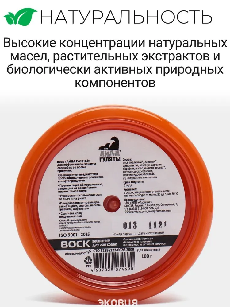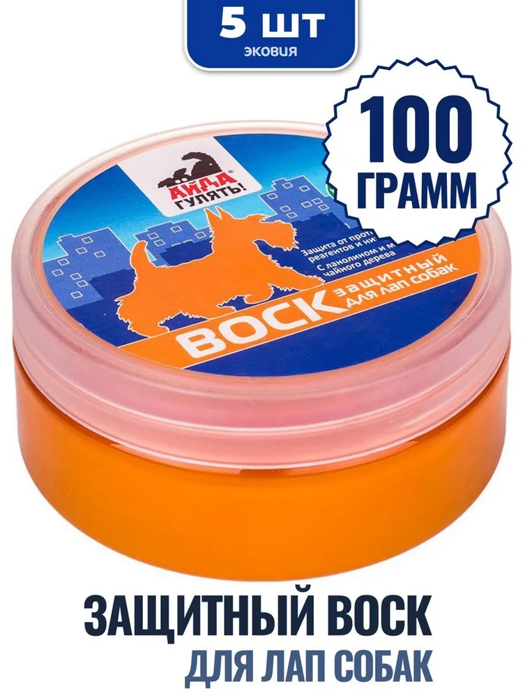 Воск АЙДА ГУЛЯТЬ для эффективной защиты лап собак во время прогулки: защищает от воздействия противогололедных реагентов и нефтепродуктов (бензин, мазут, масло); препятствует обморожению, защищает от воздействия низких температур; уменьшает скольжение лап по льду и на ринге; предотвращает травмирование льдом, снегом, песком, гравием, асфальтом; смягчает кожу подушечек лап. ВАЗЕЛИН - образует на поверхности кожи защитную водонепроницаемую пленку. МАСЛО ЧАЙНОГО ДЕРЕВА - обладает мощным антисептическим и противогрибковым действиями. ПЧЕЛИНЫЙ ВОСК И ЛАНОЛИН - увлажняют, питают и смягчают кожу лап. СПОСОБ ПРИМЕНЕНИЯ: Перед прогулкой приложить лапы к воску. После прогулки вытереть лапы салфеткой. Подходит для груминга и ухода собакам и кошкам.