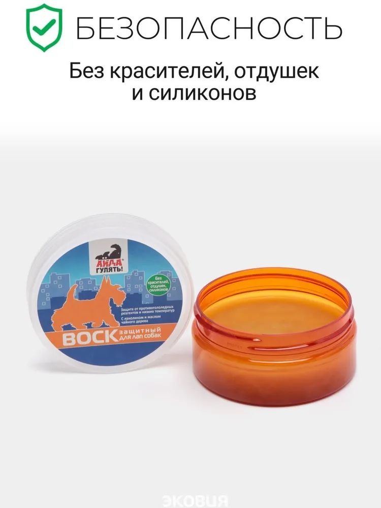 Воск АЙДА ГУЛЯТЬ для эффективной защиты лап собак во время прогулки: защищает от воздействия противогололедных реагентов и нефтепродуктов (бензин, мазут, масло); препятствует обморожению, защищает от воздействия низких температур; уменьшает скольжение лап по льду и на ринге; предотвращает травмирование льдом, снегом, песком, гравием, асфальтом; смягчает кожу подушечек лап. ВАЗЕЛИН - образует на поверхности кожи защитную водонепроницаемую пленку. МАСЛО ЧАЙНОГО ДЕРЕВА - обладает мощным антисептическим и противогрибковым действиями. ПЧЕЛИНЫЙ ВОСК И ЛАНОЛИН - увлажняют, питают и смягчают кожу лап. СПОСОБ ПРИМЕНЕНИЯ: Перед прогулкой приложить лапы к воску. После прогулки вытереть лапы салфеткой. Подходит для груминга и ухода собакам и кошкам.