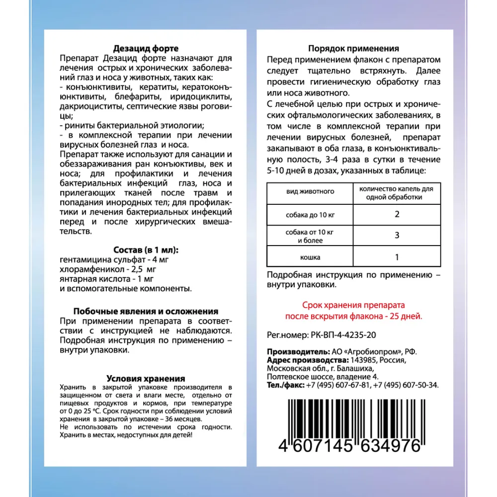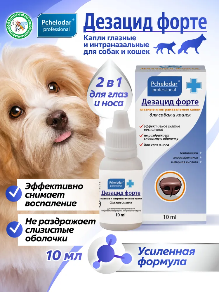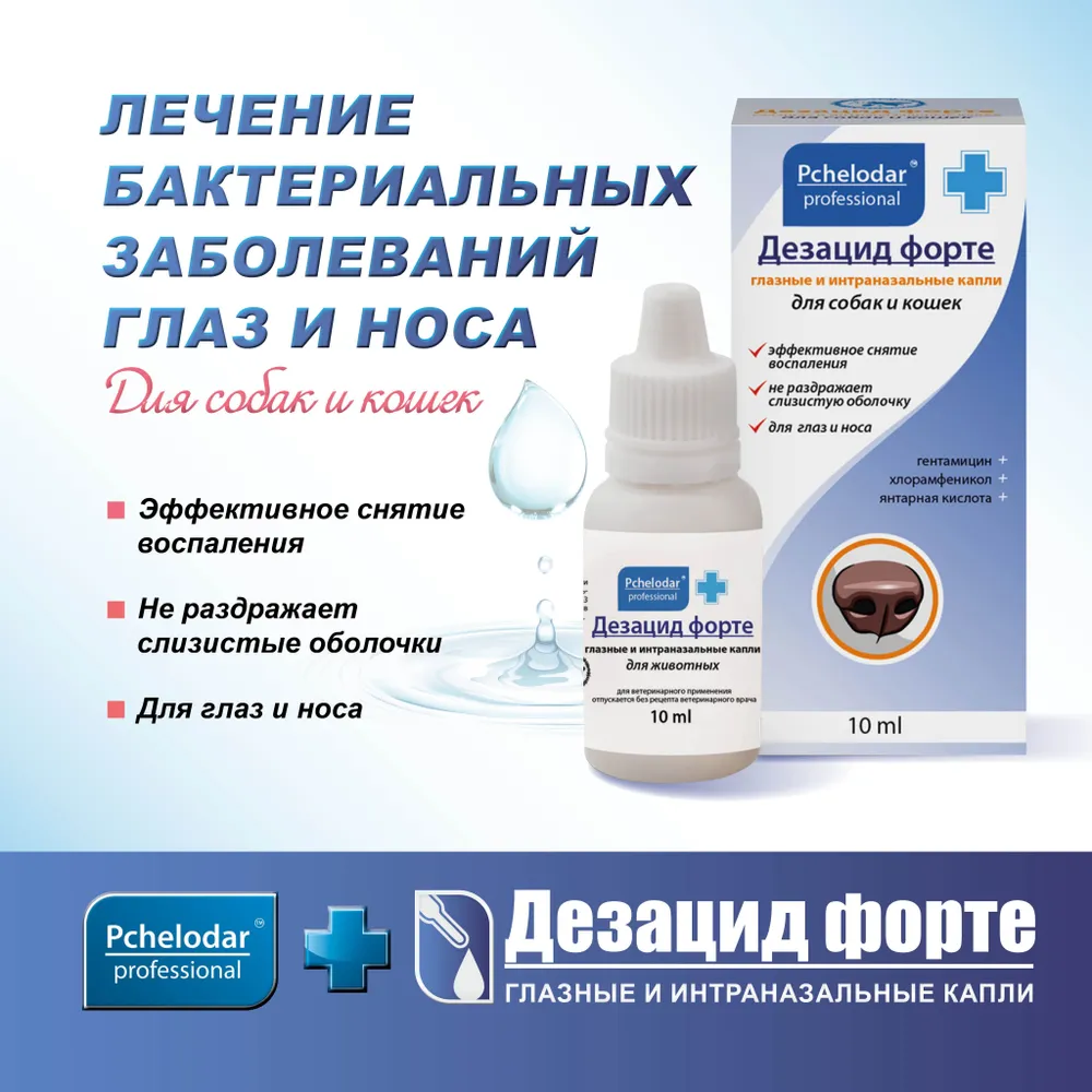 Лосьон "Ясные глазки" из серии «Апидоктор» помогает быстро размягчить и легко удалить твердые корочки, гной, струпья и выделения, а также предотвратить раздражение глаз животного пылью и грязью.Натуральные компоненты оказывают антисептическое, увлажняющее, смягчающее и восстанавливающее действие на чувствительную кожу области вокруг глаз, что особенно важно при травмах, расчесах, царапинах и т.д.Лосьон предотвращает появление темных слезных пятен на шерсти под глазами животного, улучшая внешний вид. Успокаивает кожу век, способствует снятию отека и уменьшению зуда.Снижает риск развития офтальмологических заболеваний у животного. Подходит щенкам и котятам. Лосьон применяется для ежедневного гигиенического ухода за глазами животного или по мере необходимости.Дезацид Глазные каплидля собак и кошек, 10 мл