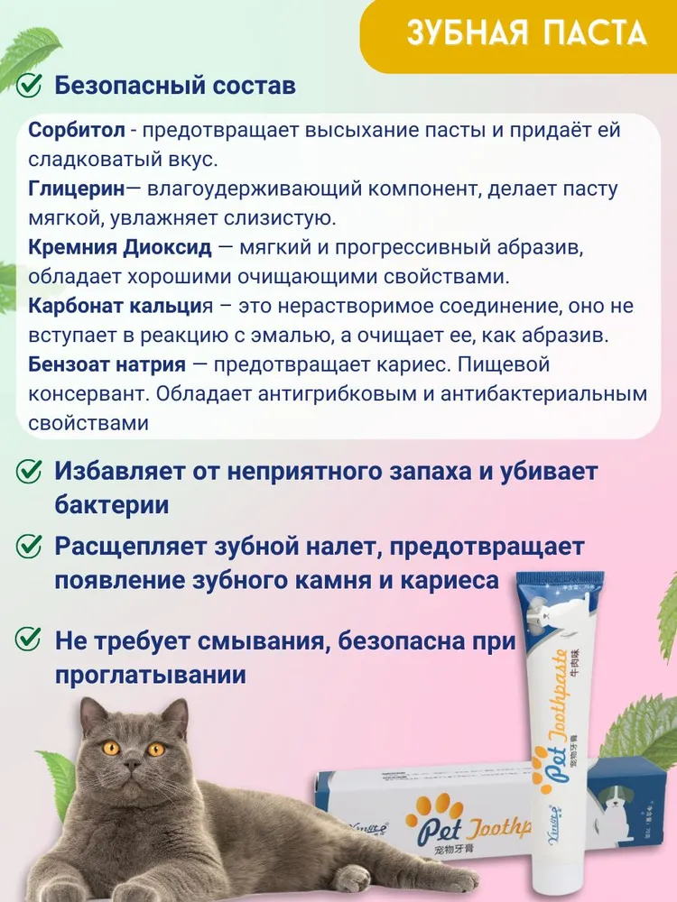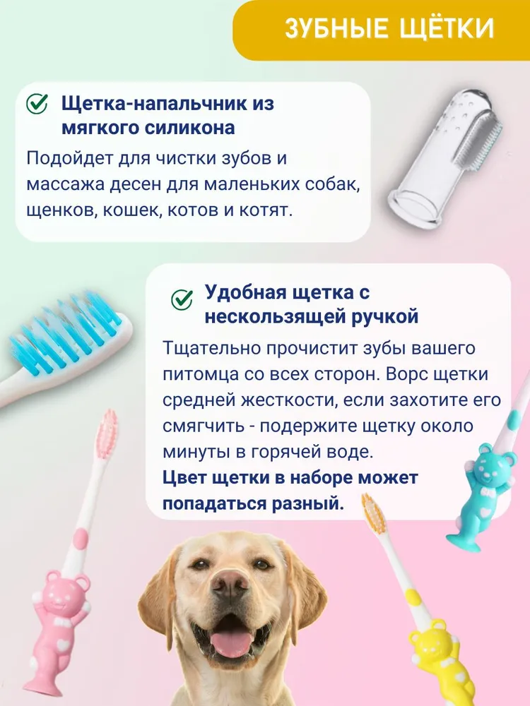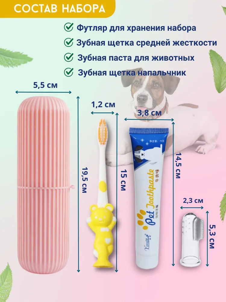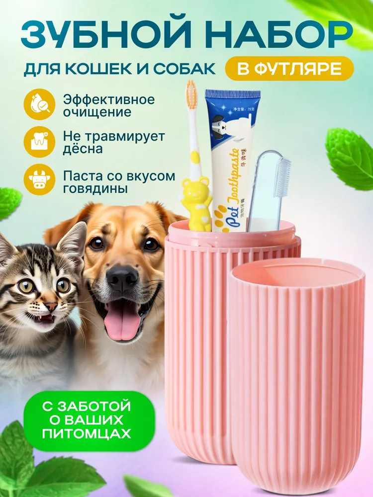 Это универсальный набор, который подойдет для собак крупных, средних и мелких пород и кошек всех пород.В набор входит: зубная паста со вкусом говядины; напальчник-массажер; зубная щетка, футляр для хранения набора.Зубная паста с мясным вкусом, который нравится большинству домашних питомцев, не требует смывания, ведь она безопасна при проглатывании. Она избавляет от неприятного запаха из пасти собак / котов и освежает дыхание, расщепляет зубной налет, предотвращает появление зубного камня и кариеса и убивает бактерии.Состав пасты: сорбитол, глицерин, CMC, HEC, диоксид кремния, карбонат кальция, порошок K12, сахарин, бензонат натрия, вода, дигидрокарбонат натрия, ароматизатор.Удобная щетка с нескользящей ручкой, быстро и тщательно прочистит зубы вашего питомца со всех сторон. Ворс щеточки средней жесткости, если захотите его смягчить - подержите щетку около минуты в горячей воде и щетинки станут мягче.Щетка-напальчник из мягкого силикона подойдет для чистки зубов для более маленьких собак, щенков, кошек, котов и котят, а также для массажа десен всем домашним животным.
