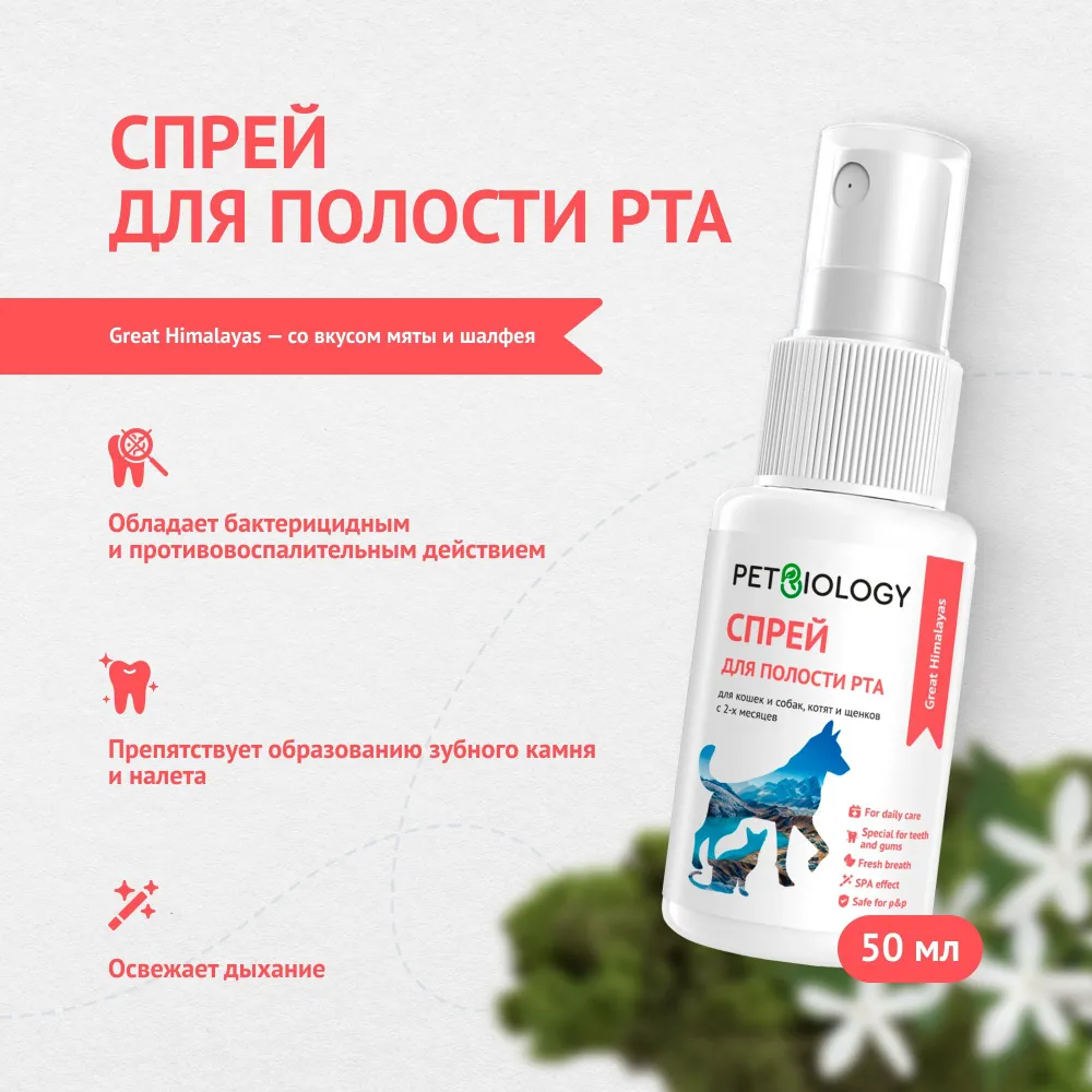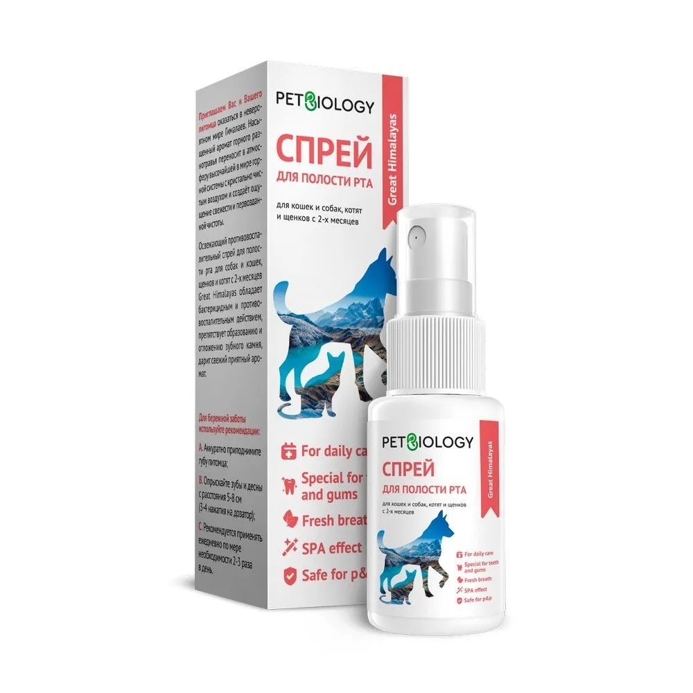 Приглашаем Вас и Вашего питомца оказаться в невероятном мире Гималаев. Насыщенный аромат горного разнотравья переносит в атмосферу высочайшей в мире горной системы с кристально чистым воздухом и создаёт ощущение свежести и первозданной чистоты.Освежающий противовоспалительный спрей для полости рта для собак и кошек, щенков и котят с 2-х месяцев Great Himalayasобладает бактерицидным и противовоспалительным действием, препятствует образованию и отложению зубного камня, дарит свежий приятный аромат.Для бережной заботы используйте рекомендации:1. Аккуратно приподнимите губу питомца;2. Опрыскайте зубы и десны с расстояния 5-8 см (3-4 нажатия на дозатор);3. Рекомендуется применять ежедневно по мере необходимости 2-3 раза в день.Красивые продукты