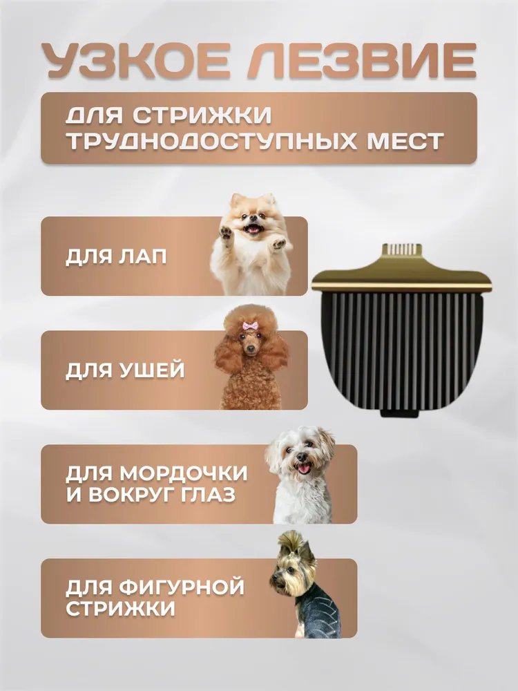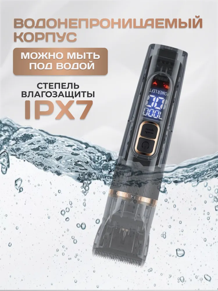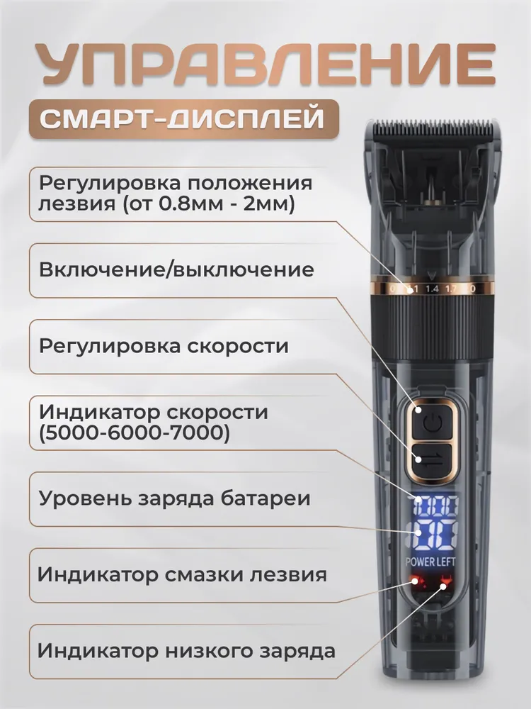 Б благодаря технологии шумоподавления, что снижает стресс питомца и делает процесс стрижки комфортным и спокойным.Теперь вы сможете сами заботиться о длине и форме шерсти своих любимцев, экономя при этом на походах к грумеру.Корпус триммера выполнен из прочного пластика, водонепроницаем, имеет степень защиты IPX7. Вы можете легко мыть машинку под водой, что существенно упрощает процесс ухода за инструментом и поддерживает его в идеальном состоянии.Имеющееся в комплекте дополнительное узкое лезвие для стрижки труднодоступных мест позволит легко обработать:- шерсть между пальцами лап, вокруг глаз, в ушках- провести гигиеническую обработку, локально удалить шесть вокруг ранок для лечения кожи- выполнить креативную фигурную стрижку, узоры для яркой индивидуальности вашего питомца.Нет необходимости приобретать отдельный триммер для лапок - просто смените лезвие!Управление простое и понятное, регулировку скорости можно производить одним пальцем прямо во время стрижки.Машинка имеет комфортный вес и эргономичную форму, удобно лежит в руке.Яркий информативный смарт-дисплей покажет выбранный режим скорости, уровень заряда, необходимость подключения зарядки и смазки лезвия.Острые и точные керамические лезвия справляются с любым типом шерсти - от тонких до плотных покровов.Лезвия не перегреваются в процессе стрижки, не требуют затачивания, имеют долгий срок службы.Машинка имеет широкий диапазон регулировки высоты стрижки:- 5 ступеней от 0,8 до 2 мм с помощью регулировочного кольца- 4 насадки 3/6/9/12 мм