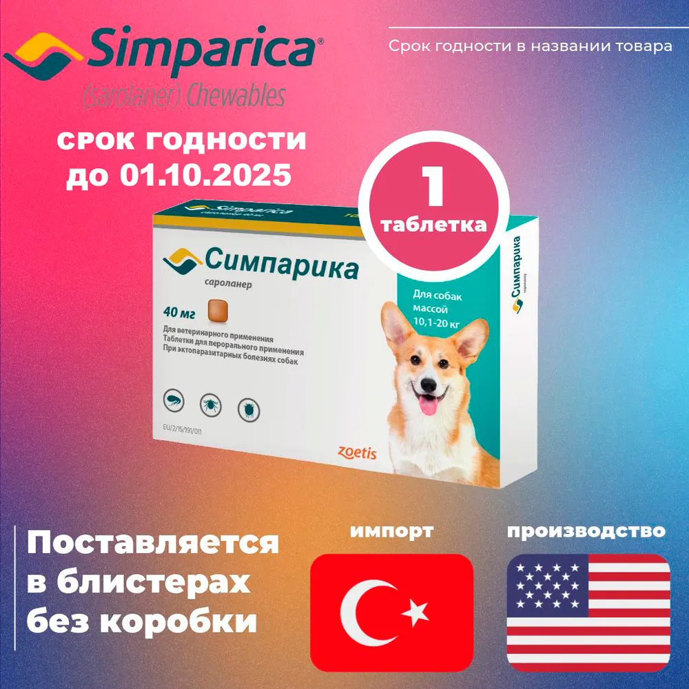 Симпарика - это эффективное средство в борьбе с блохами и клещами, предназначенное для собак весом от 10.1 до 20 кг. Каждая таблетка является надежным защитником вашего питомца, обеспечивая длительное действие и отличные результаты. Этот препарат поможет избавиться от паразитов, обеспечивая комфорт и здоровье вашего четвероногого друга.Симпарика действует быстро и эффективно, гарантируя защиту от повторного заражения. Препарат подходит для использования в любое время года, так как обеспечивает надежную защиту как от блох, так и от клещей, что особенно актуально в весенне-летний период. Простота применения делает его идеальным выбором для тех, кто хочет гарантировать надежную защиту своему питомцу без лишних усилий.Эта форма препарата обеспечивает удобство дозирования, а транспортный пакет защищает таблетку от воздействия внешней среды. Обратите внимание на срок годности, который составляет до 31 июля 2025 года, что позволяет вам запасаться при необходимости и быть уверенным в качестве продукции.Покупая Симпарика, вы выбираете надежный и безопасный способ заботы о здоровье своей собаки. Позаботьтесь о будущем вашего любимца и обеспечьте ему защиту от паразитов, выбрав этот препарат, который уже заслужил доверие у владельцев собак по всему миру. Не забывайте, что регулярное применение средств от блох и клещей – это важный шаг к здоровой жизни вашего питомца.