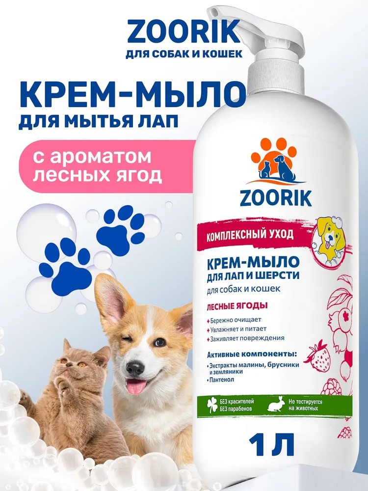 Каждая прогулка — радость для питомца и испытание для его лап. Крем-мыло ZOORIK Лесные ягоды создано для деликатного очищения после улицы: оно мягко удаляет следы грязи, пыли, городских реагентов и помогает сохранить здоровье кожи и шерсти.Формула обогащена растительными экстрактами малины, земляники и брусники — они не только придают приятный аромат, но и обеспечивают антисептический и освежающий уход. Пантенол успокаивает раздражения, заживляет микроповреждения и устраняет сухость, которая может возникать после контакта с агрессивной уличной средой.Растительный глицерин увлажняет и смягчает, предотвращая стянутость. Кондиционирующий компонент заботится о шерсти, делая её гладкой и блестящей. Кремовая текстура легко распределяется, быстро смывается и подходит даже для щенков и котят.После применения шерсть и лапы остаются чистыми, кожа — спокойной, без следов раздражений и пересушивания. Крем-мыло подходит для ежедневного использования, превращая уход в приятный ритуал заботы. Питомец доволен — вы спокойны за его здоровье и чистоту.СПОСОБ ПРИМЕНЕНИЯ: загрязненные участки тела животного (лапы, живот, морда и т.д.) смочить водой, нанести небольшое количество средства, втереть до образования пены, затем смыть теплой водой. Можно разбавить средство в емкости с водой и промыть загрязненные участки. Противопоказания: индивидуальная непереносимость компонентов. Только для наружного применения. Избегать попадания в глаза.E-COSMETIC – официальный поставщик ZOORIK.