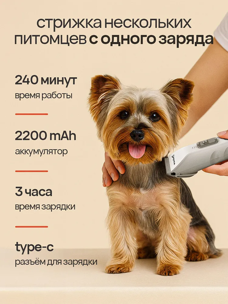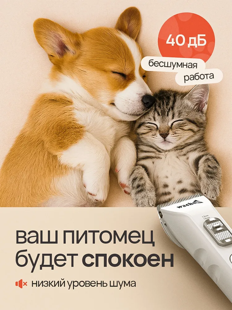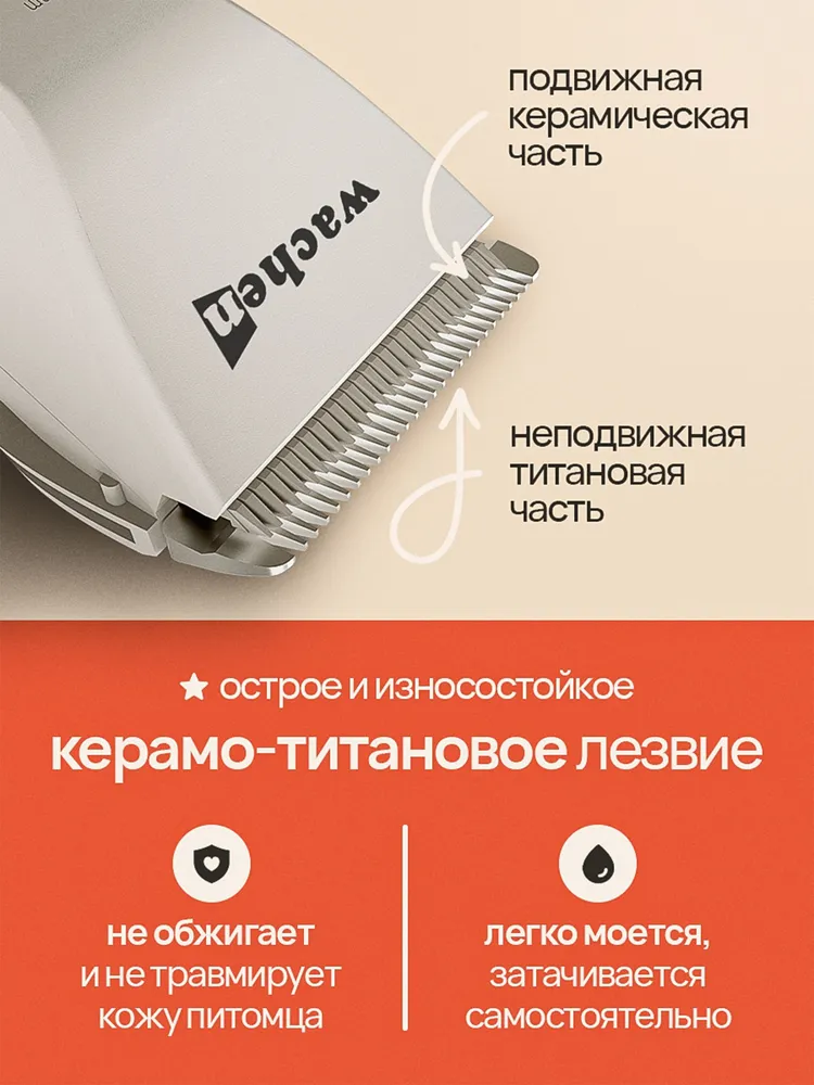 Машинка для стрижки собак и кошек Wachen W03- это удобный инструмент для домашнего и профессионального груминга.Машинка работает от аккумулятора до 4 часов непрерывной работы.Двигатель роторный мощностью 10 Вт. Также может работать от сети с длиной провода 1м. Машинка имеет индикатор остаточного заряда батареи.С помощью машинки для стрижки животных можно качественно и быстро подстричь любую шерсть питомца.Идеально подходит как для собак, так и для стрижки котов.Съемный керамо-титановый ножевой блок с самозаточкой долго сохраняет свою остроту и справляется даже с колтунами, легко чистится и заменяется на новый. Ширина ножа - 45 мм.Благодаря продуманной конструкции машинка для стрижки почти не шумит, поэтому животное не испытывает стресс и ведет себя спокойно во время стрижки.Предусмотрено 4 уровня регулировки лезвий (1,1мм-1.9мм) для стрижки разной длины, а также 6 дополнительных гребневых насадки на 3,6,9,12,15 и 18мм. Также в комплекте есть масло и щеточка для ухода за машинкой.Систематический груминг животного позволяют сохранить здоровье кожи питомца и его шерсти в чистом и хорошем состоянии.