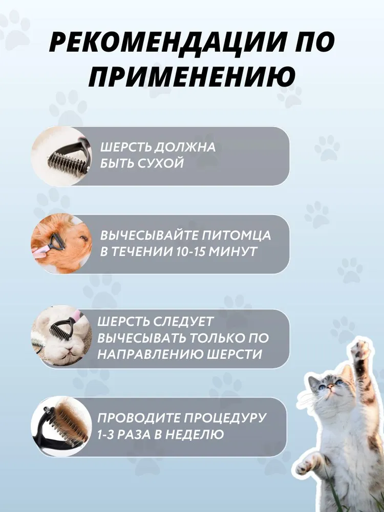Регулярное использование колтунореза может сохранить здоровье шерсти животного и предотвратить образование колтунов, что снизит затраты на уход за животным и сократит время, затрачиваемое на уход.Рекомендации по применению- Расчесывайте колтунорезом шерсть на проблемном участке по направлению роста волос, двигаться нужно плавно- Избегайте чрезмерного надавливания на тело- Колтунорез противопоказан в том случае, если у питомца имеются повреждения (ссадины, царапины), кожные заболевания (аллергия, экзема, дерматит)!- Инструмент для удаления колтунов не используется ежедневно