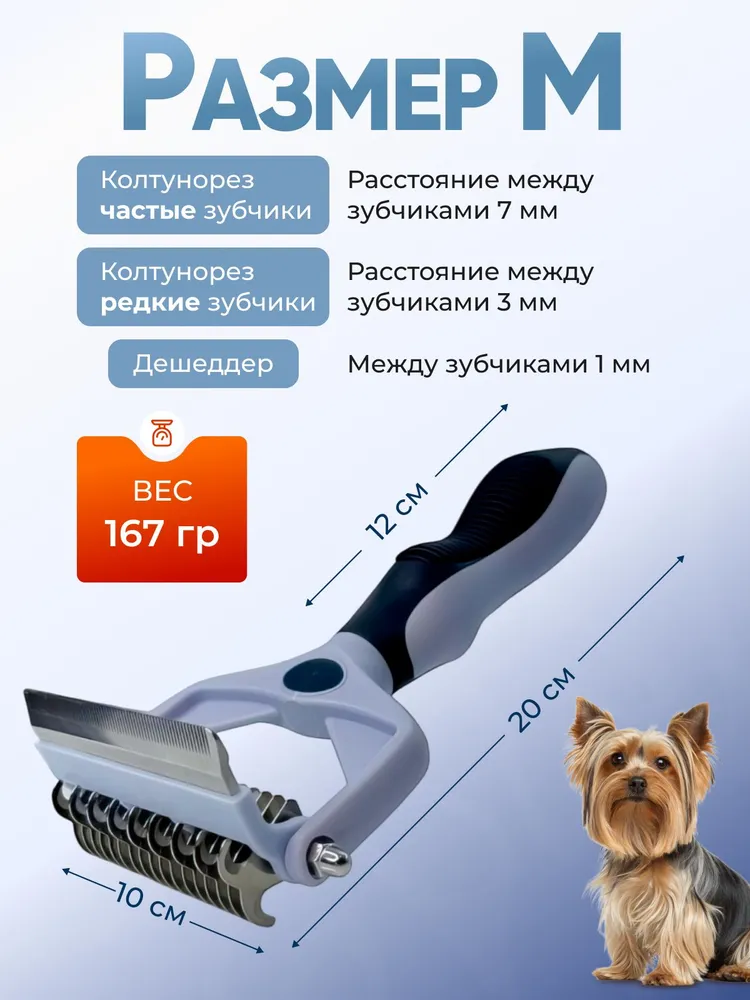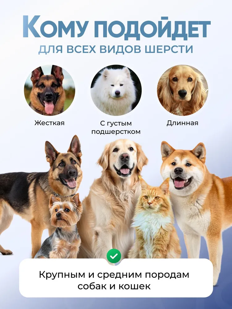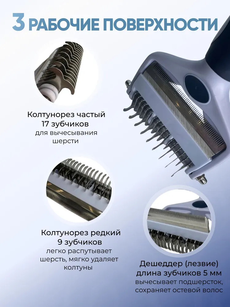 Расческа колтунорез для крупных и средних собак 3 в 1 – это инструмент для груминга, который позволит сократить период линьки Вашего питомца на 90%. Она отлично подходит как для короткошерстных пород, так и для длинношерстных и гладкошерстных питомцев. Вы легко сможете вычесывать колтуны собак и кошек с помощью данного аксессуара.Чесалка 3 в 1 изготовлена с применением высоко качественных металлических элементов, что обеспечивает долговечность использования. Она эффективно справляется с вычесыванием подшерстка, колтунов и лишней шерсти благодаря конструкции инструмента. Зоотовары такого типа нужны каждому обладателю крупных и средних питомцев. Расческа имеет 3 рабочие поверхности: колтунорез редкий - 9 зубчиков; колтунорез частый - 17 зубчиков; дешеддер - 66 зубчиков.Щетка незаменима для ухода за шерстью таких животных, как собаки или кошки различных пород. Подходит как для использования дома, так и в профессиональных салонах по уходу за животными. Безопасный дизайн позволяет избежать повреждений кожи ваших любимцев при вычесывании.Расческа обладает эргономичной конструкцией рукоятки. Это дает возможность использовать приспособление длительное время без чувства усталости. Такая щётка - идеальный дешеддер от колтунов и подшерстка.Аксессуар значительно экономит время на уход и сокращает количество волос по всему дому. Благодаря высочайшей эффективности инструмент быстро завоевал популярность среди владельцев домашних питомцев.Расческой можно вычесывать густую длинношерстную шерсть больших собак или короткую собачью шерсть более миниатюрных пород. Фурминатор универсален: работает как щётка для животных разной породы и строения шерсти, помогая справляться с задачами любой трудности.Этот колтунорез станет надежным помощником в вашем арсенале по уходу за друзьями меньшими.Ваша собака заслуживает лучшего ухода, а данная чесалка обеспечит это сполна! Инструмент поможет избавить ваш дом от нежелательной шерсти и максимально продлить красоту шерсти питомца до следующего груминга!