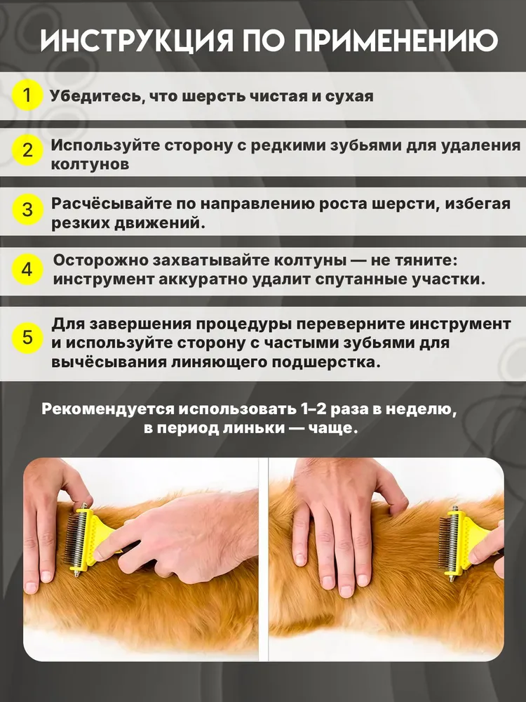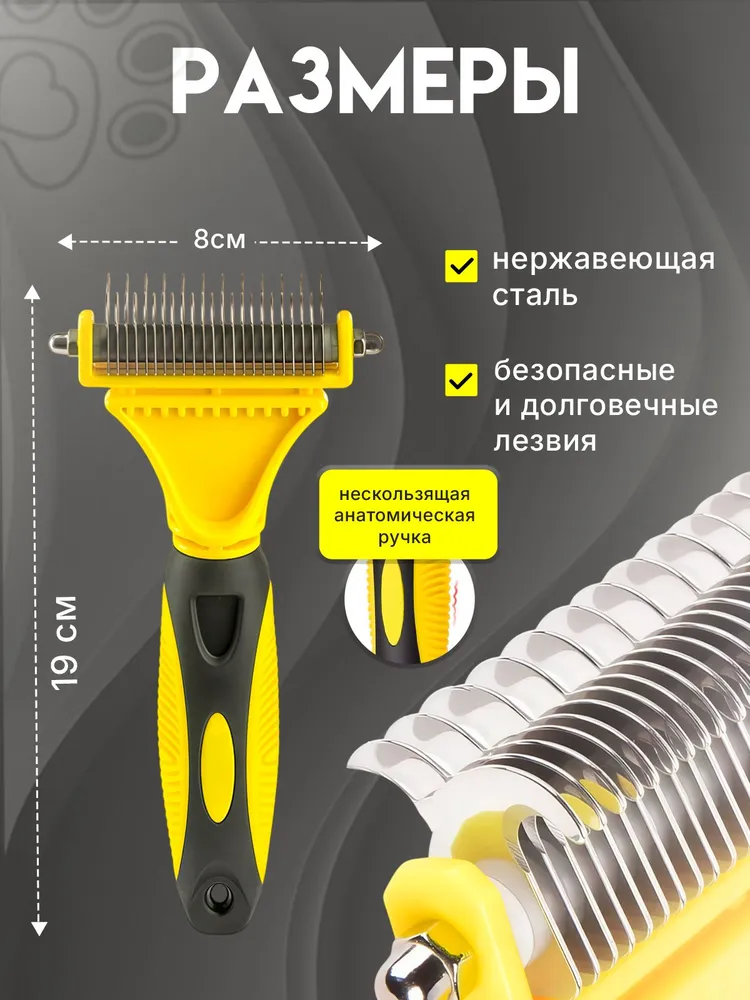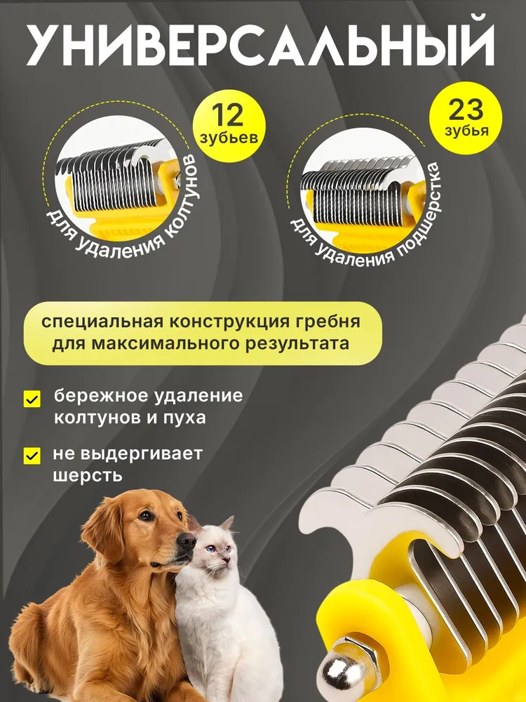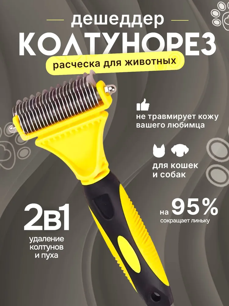 Колтунорез и дешеддер 2 в 1Представляем вам универсальный инструмент для ухода за шерстью вашего любимца – Колтунорез и дешеддер для кошек и собак, который справится с любыми задачами!Эта многофункциональная чесалка для кошек и собак станет незаменимым помощником в поддержании красоты и здоровья вашего питомца. С ее помощью вы легко распутаете даже самые запутавшиеся колтуны, удалите выпавшую шерсть и предотвратите образование новых колтунов. Благодаря специальной конструкции щетки, она действует как эффективный фурминатор для кошек и дешеддер для собак, бережно удаляя подшерсток и оставляя шерсть мягкой и блестящей.ЭФФЕКТИВНЫЙ РЕЗУЛЬТАТ:1. Красивая и ухоженная шерсть — колтунорез и дешеддер помогает поддерживать шерсть домашних животных в идеальном состоянии, делая ее блестящей и здоровой.2. Уменьшение линьки на 95% — значительное сокращение количества выпадающей шерсти, что облегчает уход за животными и поддержание чистоты в доме.3. Довольный питомец — расческа для кошек и собак способствует улучшению самочувствия и настроения питомца, делая его более счастливым и активным.4. Массажный эффект — пуходерка оказывает благотворное воздействие на кожу и мышцы животного, обеспечивая дополнительный комфорт и расслабление.5. Чистота в доме — благодаря уменьшению линьки и улучшению состояния шерсти, в доме становится меньше шерсти и пыли, что облегчает поддержание чистоты.КАЧЕСТВЕННЫЙ и НАДЕЖНЫЙБлагодаря специальной конструкции колтунореза и качественным материалам, таким как нержавеющая сталь и прочный пластик, эта расческа прослужит вам долгие годы, помогая поддерживать красоту и здоровье вашего питомца