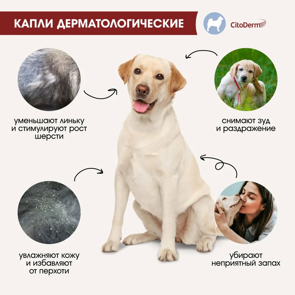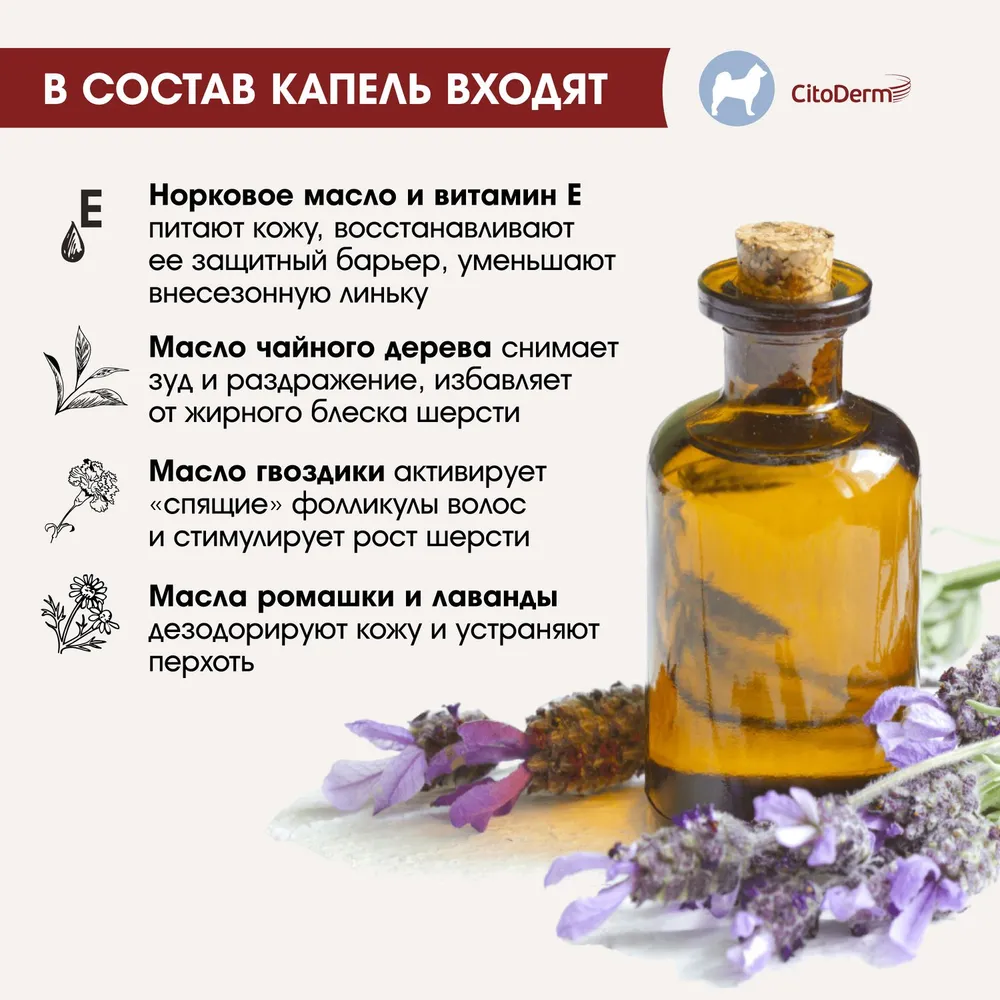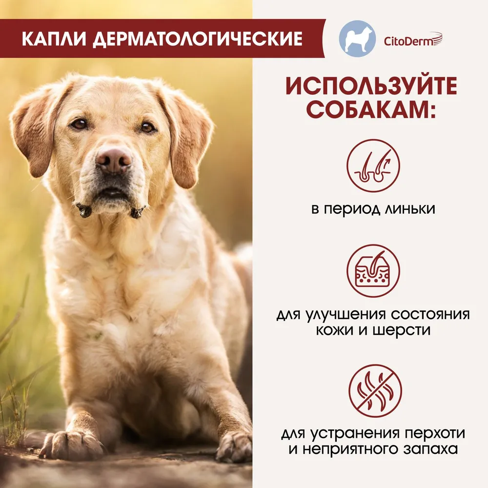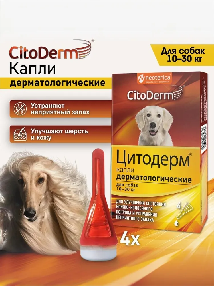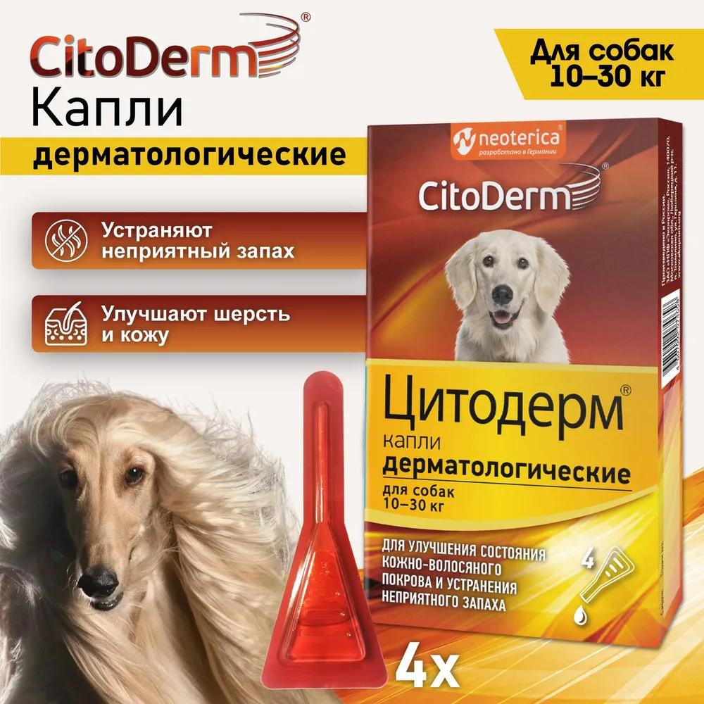 Мы часто сталкиваемся с дерматологическими проблемами питомцев: постоянная линька, плохое качество шерсти, шелушение на коже или запах «псины». В этих случаях нашим кошкам и собакам нужен специальный уход. \nРешить проблемы помогут дерматологические капли CitoDerm!\n\nПитательные масла в дерматологических каплях CitoDerm глубоко проникают в кожу, накапливаются с волосяных фолликулах и сальных железах и обеспечивают непревзойденный и долгосрочный результат.\n\nCitoDerm капли дерматологические решают проблемы кожи и шерсти:\n✔ Уменьшают линьку\n✔ Стимулируют рост шерсти\n✔ Увлажняют кожу и избавляют от перхоти\n✔ Снимают зуд и раздражение\n✔ Устраняют неприятный запах «псины»\n\nИспользуйте собакам:\n• С сильной линькой\n• С тусклой, блеклой, редкой шерстью\n• Для снятия симптомов аллергии\n• С неприятным запахом от шерсти\n\nСпособ применения:\n• Нанесите средство на холку питомца, в 2–4 местах, недоступных для слизывания.\n• Используйте по 1 пипетке 1 раз в неделю\n• Оптимальный курс применения 2 месяца\n• Для закрепления результата продолжите использовать средство 1 раз в 2 недели\n\nНе желательно купать животное до обработки и после нее в течение 2 дней.\n\nСостав: масло виноградных косточек, масло жожоба, эфирное масло ромашки, эфирное масло чайного дерева, эфирное масло лаванды, эфирное масло гвоздики.\n\nВ упаковке: 4 тюбика-пипетки по 3 мл.\n\nСостав разработан компанией Neoterica (Германия).