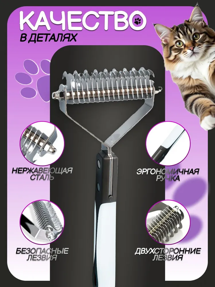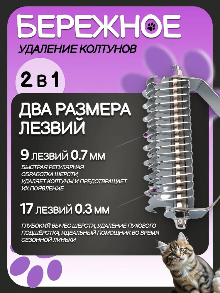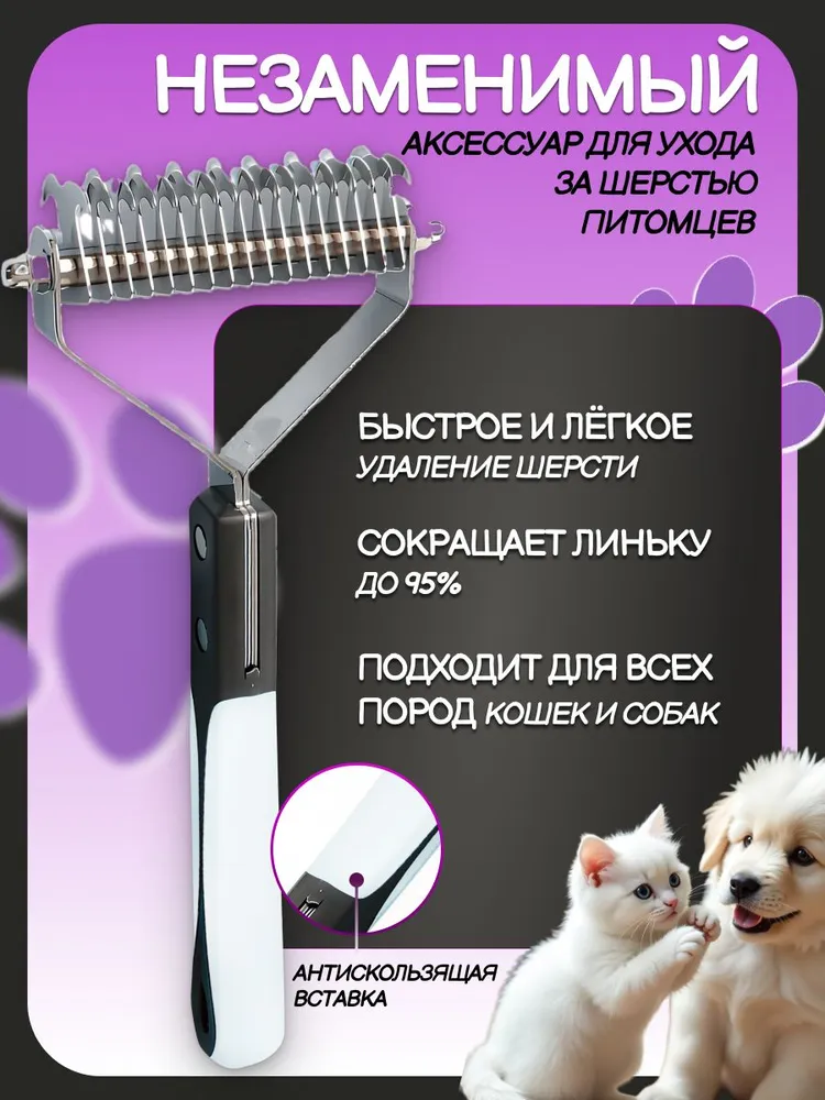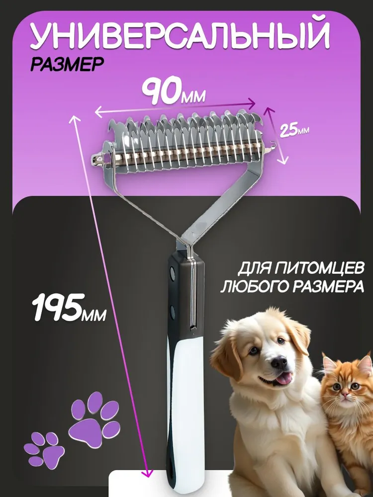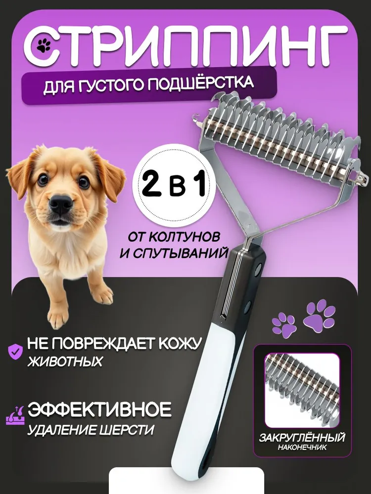 Представляем профессиональный инструмент для ухода за шерстью домашних питомцев – стриппинг 2 в 1 двусторонний широкий с 17+9 лезвиями, предназначенный для животных с длинной, пушистой, густой шерстью, а также для жесткошерстных пород собак, нуждающихся в искусственной линьке. Этот колтунорез и пуходерка объединяют в себе максимальную эффективность и удобство, что делает процесс груминга быстрым и комфортным как для питомца, так и для его владельца. С одной стороны оснащенный 9 острыми лезвиями для бережного удаления колтунов и подготовки шерсти к дальнейшей обработке, а с другой – 17 лезвиями для более глубокой обработки подшерстка, стриппинг идеально подходит для экспресс-линьки, эффективно справляется с обильной линькой и густой шерстью, значительно снижает количество шерсти в доме, на полу, мебели и вашей одежде. Инструмент для ухода за шерстью создан специально для собак и кошек, обеспечивая им здоровую и ухоженную шубку без колтунов и спутанности. Стриппинг бережно удаляет отмерший подшерсток, не повреждая остевой волос. Безопасные лезвия глубоко проникают в густую шерсть, обеспечивают эффект легкого массажа кожи, стимулируют кровообращение в кожных покровах, способствуют равномерному распределению естественной жировой смазки шерсти, что делает шубку Вашего питомца более здоровой и блестящей. Лезвия имеют прочное цельнометаллическое основание из качественной нержавеющей стали, которое выдержит любое усилие при обработке. Ручка из прочного пластика с антискользящей вставкой максимально прочная и долговечная, не боится воды. Благодаря эргономичному дизайну ручки, пользоваться стриппингом легко и удобно, он не скользит в руке и не требует больших усилий при использовании. Благодаря конструкции из полностью водостойких материалов инструмент легко можно очищать с помощью воды и моющих средств. Теперь уход за шерстью станет более профессиональным и менее стрессовым для вашего питомца. Незаменимый помощник для каждого хозяина, заботящегося о своем любимце, стриппинг двусторонний – это качественный инструмент для груминга, который поможет сохранить шерсть вашего питомца в отличном состоянии. Попробуйте и убедитесь, что стриппинг идеально подходит для ухода за длинной, густой шерстью, шестью с обильным плотным подшерстком, и обладает всеми необходимыми качествами для удобства и безопасности вашего питомца.