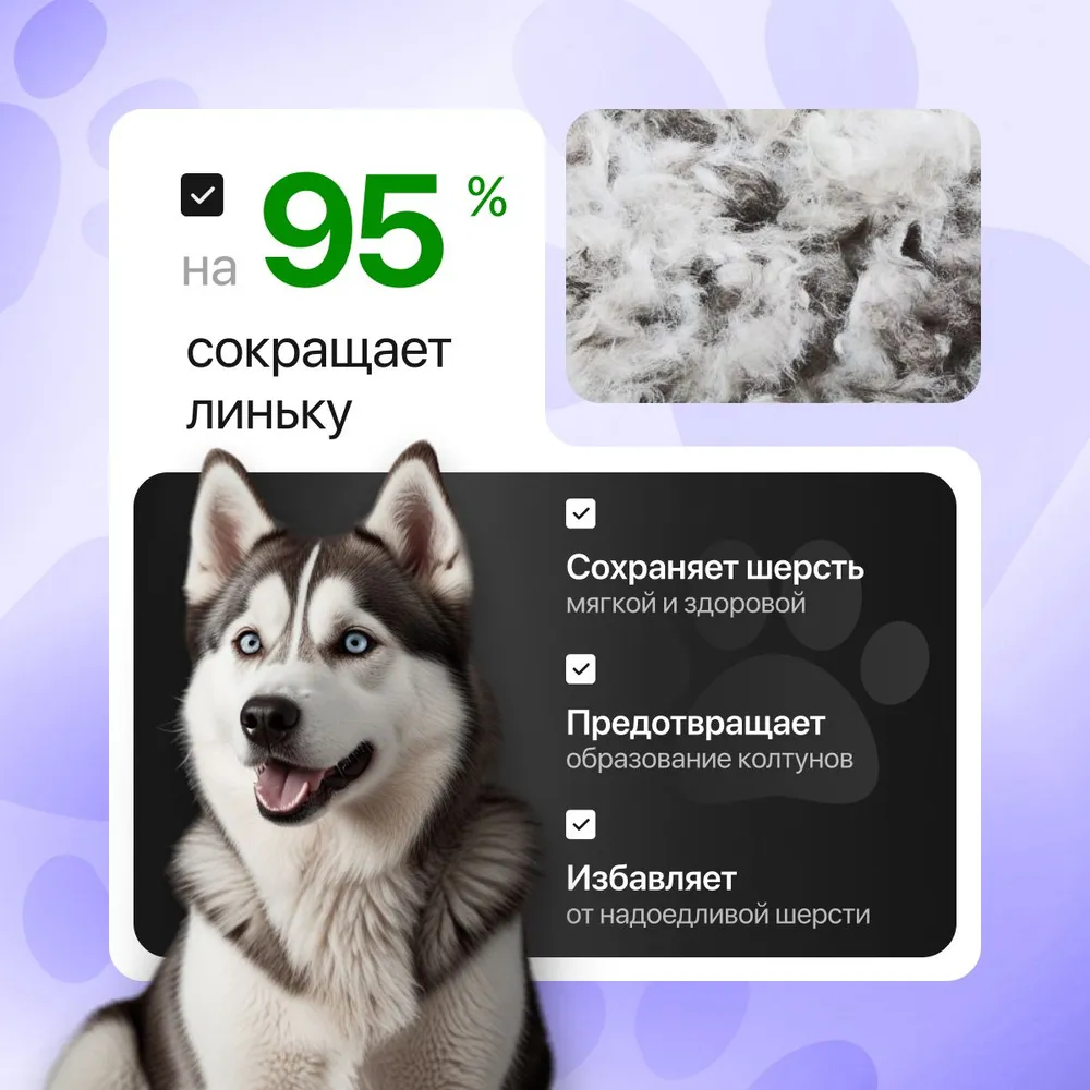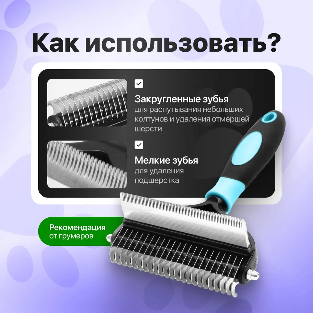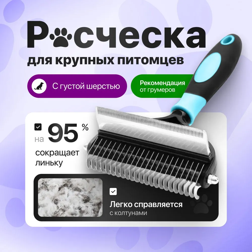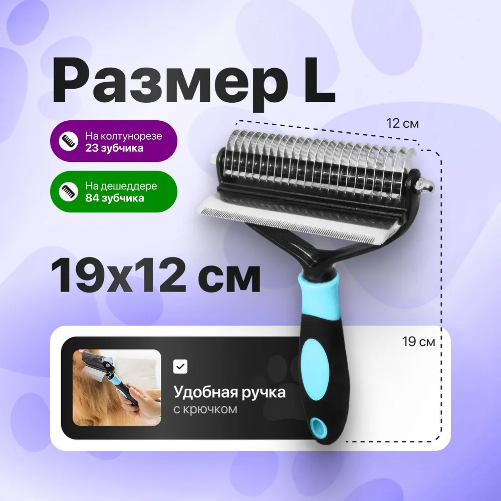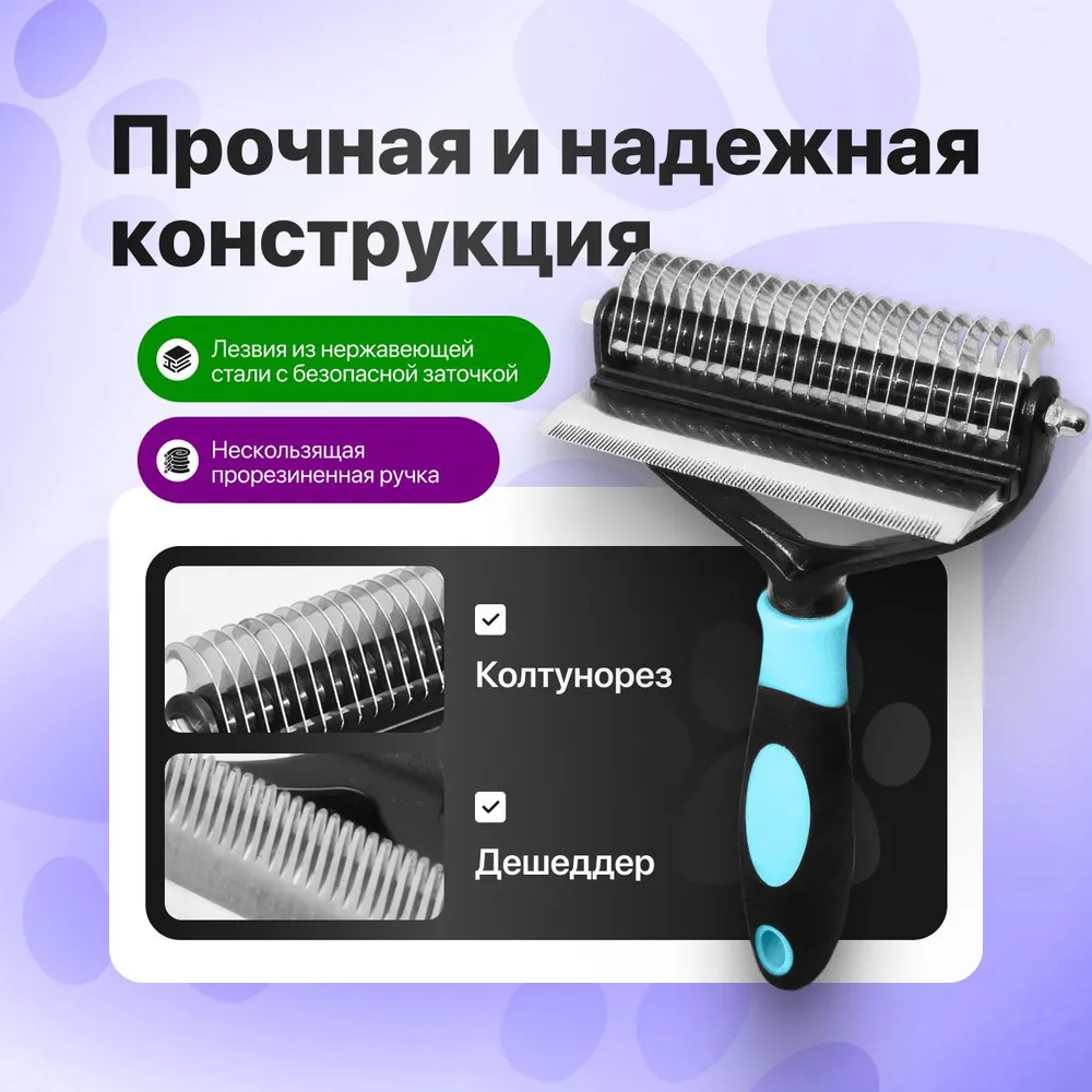 Многофункциональное устройство.Домашние животные линяют дольше и интенсивнее своих уличных собратьев. Регулярное вычёсывание помогает удалить отмершие шерстинки и существенно сокращает количество шерсти на мебели, полу и вашей одежде.На помощь вам придёт наша двухсторонняя расчёска для крупных собак и кошек. Она объединяет в себе дешеддер и колтунорез.Лезвия дешеддера заточены под специальным углом, что позволяет эффективно вычёсывать подшёрсток, не травмируя кожу животного. Оптимальное расстояние между лезвиями колтунареза даёт возможность срезать колтуны не дёргая их.Применение.Все модели колтунорезов-дешеддеров предназначены для груминга в домашних условиях. Особенности использования этого инструмента зависят от породы, размера питомца, густоты и плотности его шерсти.В период активной линьки специалисты рекомендуют использовать колтунорез-дешеддер в среднем 1-2 раза в неделю, в другое время подшерсток вычесывают реже – примерно 1-2 раза в месяц.Используйте гребень с закруглёнными зубьями для распутывания небольших колтунов и удаления отмершей шерсти.Затем стороной с мелкими зубьями удалите подшёрсток.Преимущества.Инструмент работает по принципу триммера – убирает лишний подшерсток и отмершие волоски, бережно массируя кожу питомца и не причиняя вред основному остевому волосу.Он распутает колтуны и мягко удалит подшёрсток, сокращая период линьки на 95%.Рукоятка - выполнена из высококачественного пластика с прорезиненной накладкой, что приносит удовольствие в использовании и не скользит в руке.Благодаря нашей расчёске вы избавитесь от надоедливой шерсти в доме, а ваш питомец получит удовольствие от массажа и его шерсть будет всегда ухоженной и здоровой!