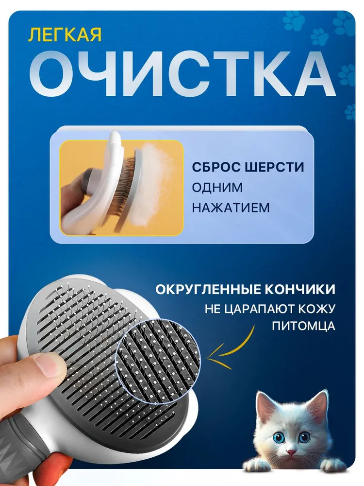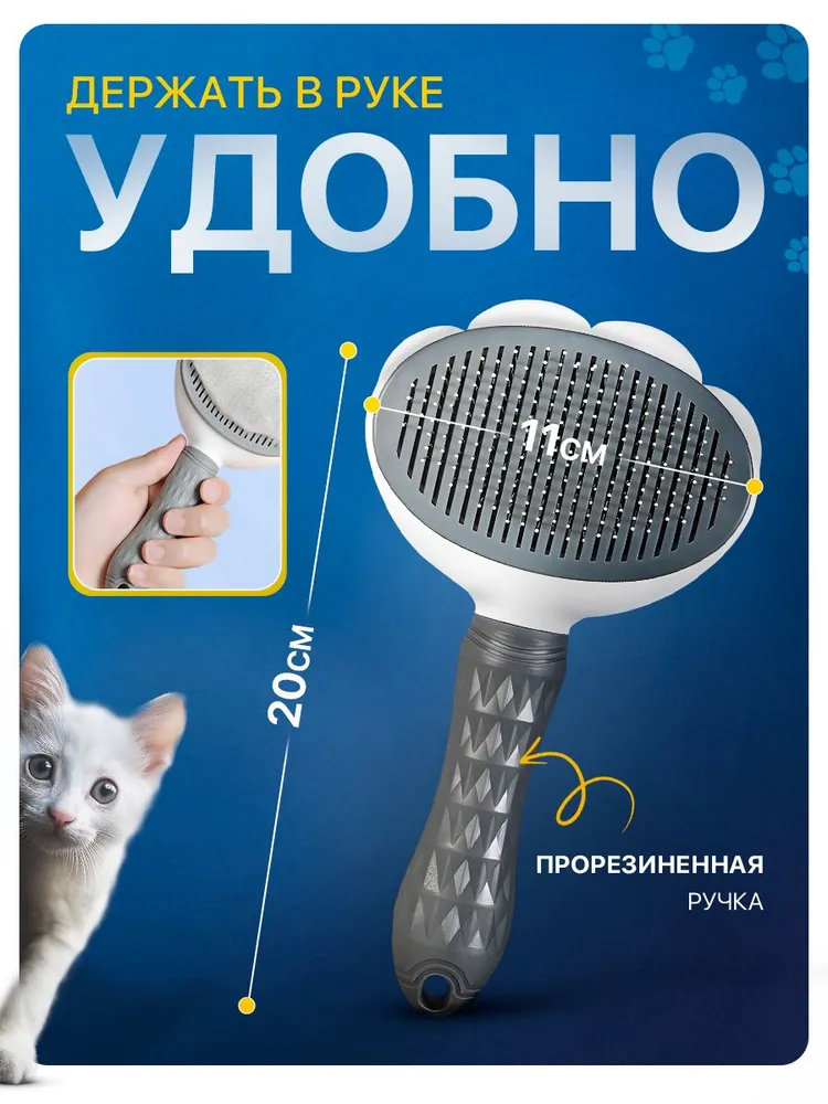 Прочная удобная, самоочищающаяся от шерсти, расческа для собак, кошек любой породы. Массажная щетка для груминга животных подходит для домашнего использования и профессиональных грумеров.Щетка оснащена резиновой ручкой, благодаря которой инструмент прочно фиксируется в руке, а кнопка самоочистки легко сбрасывает шерсть с инструмента, что делает процесс вычесывания комфортным.Защитные края дешеддера предотвращают давление расчёски на кожу и не причиняют боли или иного дискомфорта домашним животным, более того-многим питомцам очень нравится эта процедура.Удобная чесалка подходит для всех пород котов и собак, крупных и мелких питомцев. Кроме того, щетка пуходерка подходит для кроликов и других маленьких животных.Она помогает не только сохранить чистоту в доме, но и укрепить здоровье и благополучие животного.