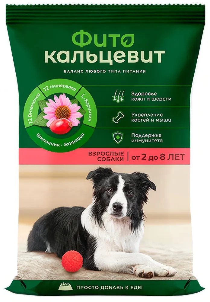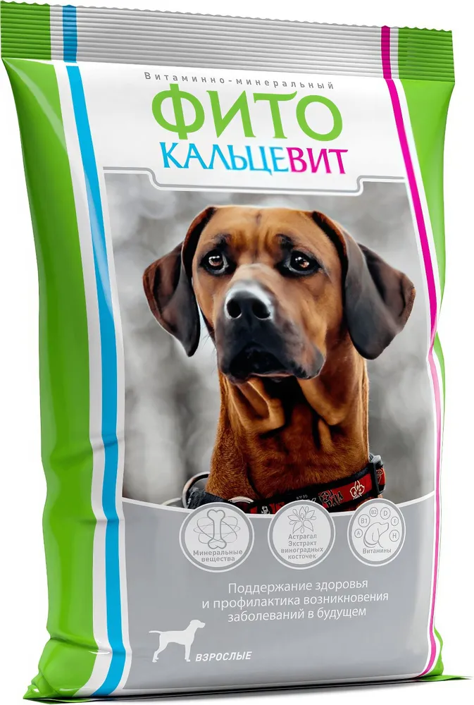 Фитокальцевит для взрослых собак Витаминно-минеральный функциональный корм. Поддерживает здоровье взрослых животных иповышает устойчивость организма кинфекционным заболеваниям. Ингредиенты Мясокостная мука Цитрат кальция Минеральные вещества Витаминный комплекс Порошок из клубней топинамбура Экстракт виноградных косточек Экстракт астрагала Пищевая ценность (не менее) Белки 35% Жиры 11% Клетчатка 0,4% Зола 9% Кальций 13,9% Фосфор 7,1% Состав / 100 г (не менее): Витамин А 20000МЕ Витамин D3 700МЕ Витамин E 80МЕ Витамин В1 3мг Витамин В2 5мг Витамин В4 180мг Витамин В6 2мг Витамин В12 100 мкг Биотин 100 мкг Пантотенат кальция 10мг Никотиновая кислота 15мг Фолиевая кислота 2мг Калий 1,35г Магний 250мг Натрий 240мг Сера 630мг Железо 120мг Йод 1,2мг Медь 1,0мг Марганец 10мг Цинк 18мг Кремний 15мг Фтор 0,3мг Селен 10мкг Действие Способствует поддержанию здоровья костей изубов, укреплению мускулатуры животных. Обеспечивает поступление ворганизм дефицитных микронутриентов (йода, железа, цинка, селена, кремния) ивысокую степень ихусвоения благодаря входящему всостав корма порошку топинамбура. Предупреждает возникновение иразвитие опухолей, оказывает тонизирующее действие, стимулирует кровоток испособствует насыщению тканей ивнутренних органов кислородом благодаря входящему вего состав экстракту астрагала. Способствует укреплению стенок кровеносных сосудов иобновлению клеток, снижает риск развития заболеваний сердечно-сосудистой системы, может снимать симптомы аллергии засчет антиоксидантного действия экстракта виноградных косточек. Стимулирует моторику желудочно-кишечного тракта, поддерживает развитие вкишечнике полезной микрофлоры благодаря инулину изклубней топинамбура. Повышает общее качество жизни животного имобилизует естественные защитные силы организма. Рекомендации по применению Фитокальцевит для взрослых собак предназначен для включения всостав рациона животных, начиная совторого года жизни. Рекомендуемая ежедневная суточная доза корма определяется взависимости отразмера животного: Размер собаки Взрослые собаки Беременные и кормящие суки Миниатюрные породы 1 чайная ложка 1,5 чайные ложки Мелкие породы 2 чайные ложки 1 столовая ложка Средние породы 3 чайные ложки 2 столовые ложки Крупные породы 2 столовые ложки 4 столовые ложки Для лучшего усвоения всех питательных веществ порцию Фитокальцевита для взрослых собак необходимо смешать сосновным кормом. Для предупреждения снижения активности витаминов или ихразрушения корм недолжен быть горячим. Фитокальцевит длявзрослых собакрекомендуется применять как при натуральном питании, такипри кормлении готовыми экструдированными кормами для восполнения потребности ввитаминах иминеральных веществах, содержание которых снижается после вскрытия упаковки спромышленным кормом. При стрессах, повышенных физических нагрузках, ослабленном организме суточная порция может быть увеличена в1,5-2раза. Особенности применения Нерекомендуется вводить Фитокальцевит для взрослых собак врацион животного при желудочно-кишечных расстройствах исукам втечение одной недели после родов. Условия хранения Хранить всухом прохладном месте. Срок годности: 1год сдаты изготовления. Внимание! Возможно изменение цвета Фитокальцевита от светло-бежевого до коричневого.