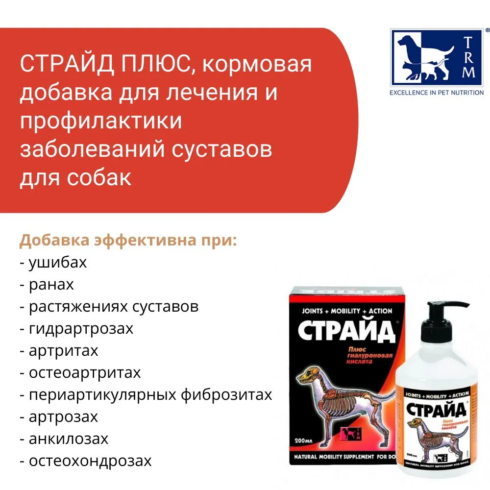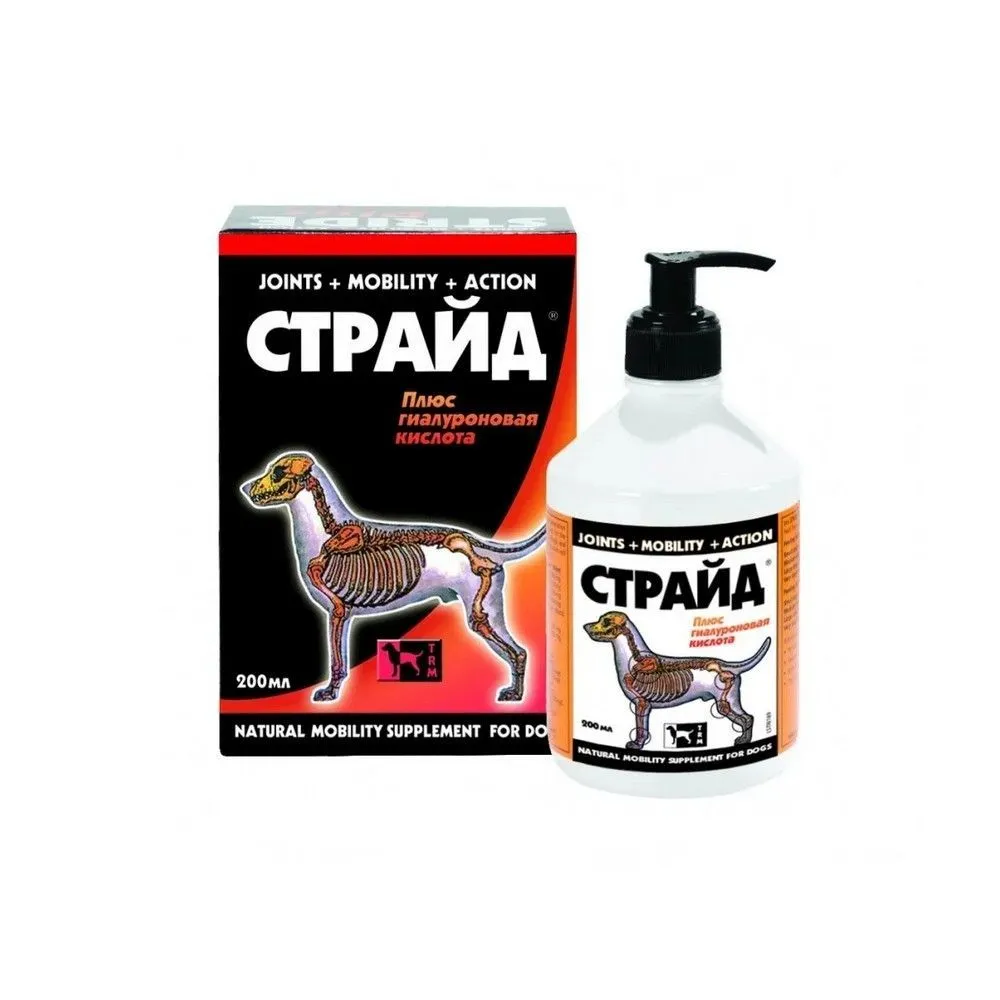 STRIDE PLUS — это кормовая добавка, предназначенная для поддержания здоровья суставов у собак. Она содержит глюкозамин, хондроитин, гиалуроновую кислоту и другие компоненты, которые способствуют восстановлению хрящевой ткани и улучшению подвижности суставов.Преимущества:Эффективность: STRIDE PLUS помогает восстановить хрящевую ткань и улучшить подвижность суставов, что может снизить риск развития заболеваний опорно-двигательного аппарата у собак.Безопасность: не имеет побочных эффектов и противопоказаний при соблюдении дозировки и рекомендаций по применению.Простота использования: жидкость легко добавлять в корм или давать принудительно.Универсальность: подходит для собак всех пород и возрастов.Поддержка здоровья: способствует поддержанию здоровья суставов и профилактике различных заболеваний.Профилактика: регулярное применение добавки может помочь предотвратить развитие артрита и других проблем с суставами.Качество: производится из натуральных компонентов, что обеспечивает высокое качество продукта.Консультация специалиста: перед применением рекомендуется проконсультироваться с ветеринарным врачом.Способ применения:Дозировка:Для собак весом до 5 кг — 2 мл в день;Для собак весом от 5 до 15 кг — 4 мл в день;Для собак весом более 15 кг — 8 мл в день.Продолжительность курса зависит от состояния животного и рекомендаций ветеринарного врача.Способ применения:Жидкость можно добавлять в корм или давать собаке принудительно. Перед применением необходимо тщательно встряхнуть флакон.Важно помнить, что применение любых лекарственных средств должно осуществляться только по назначению ветеринара.