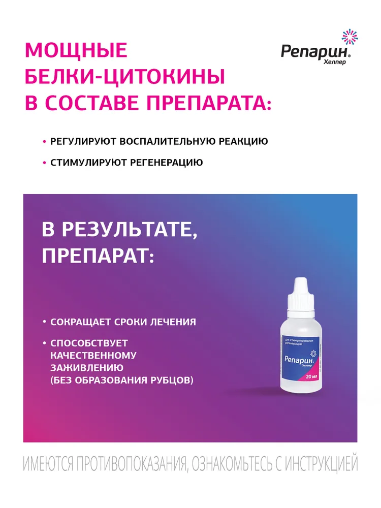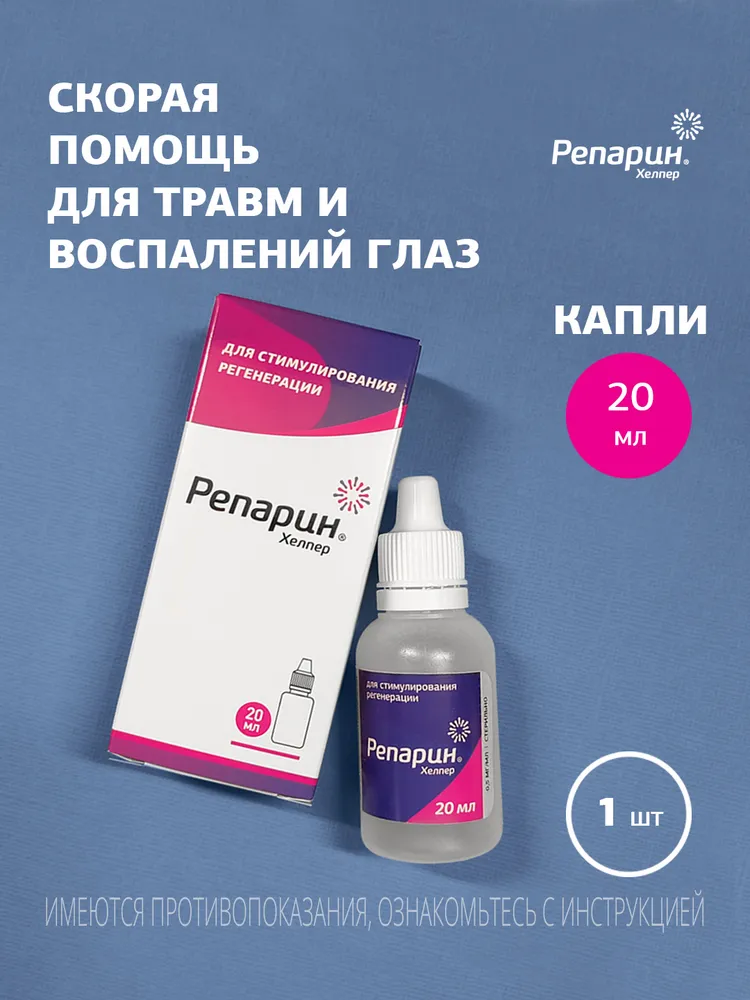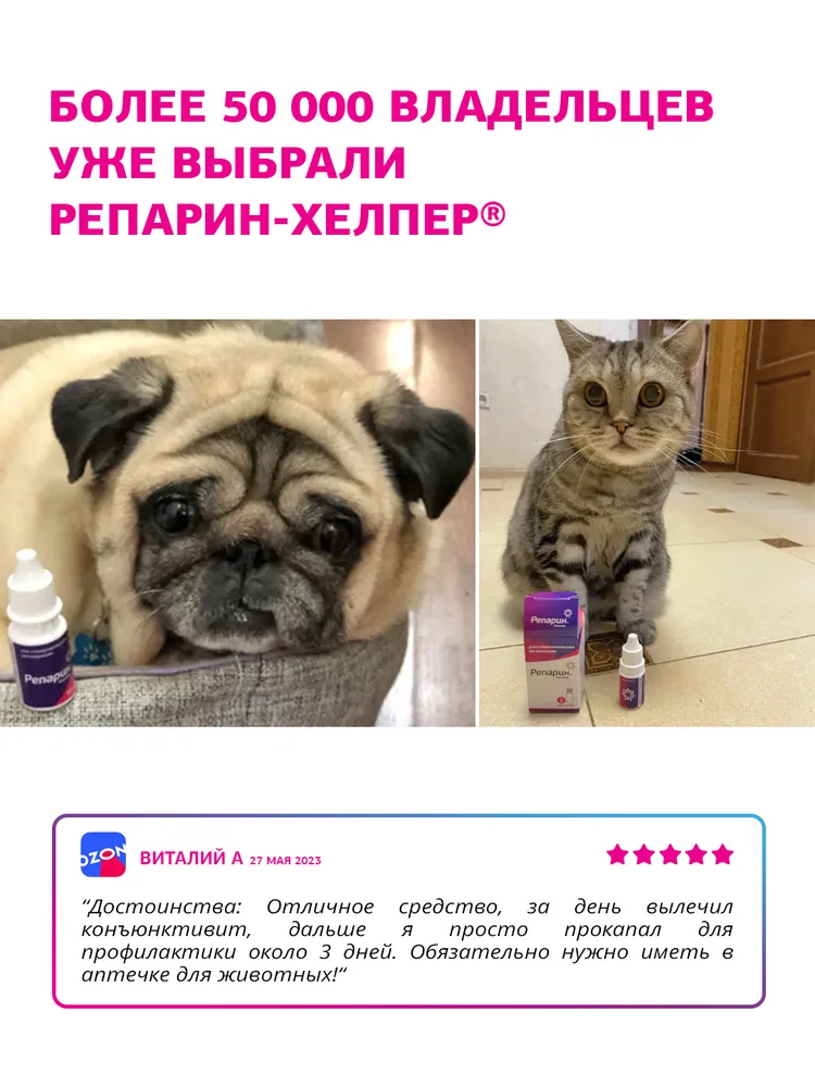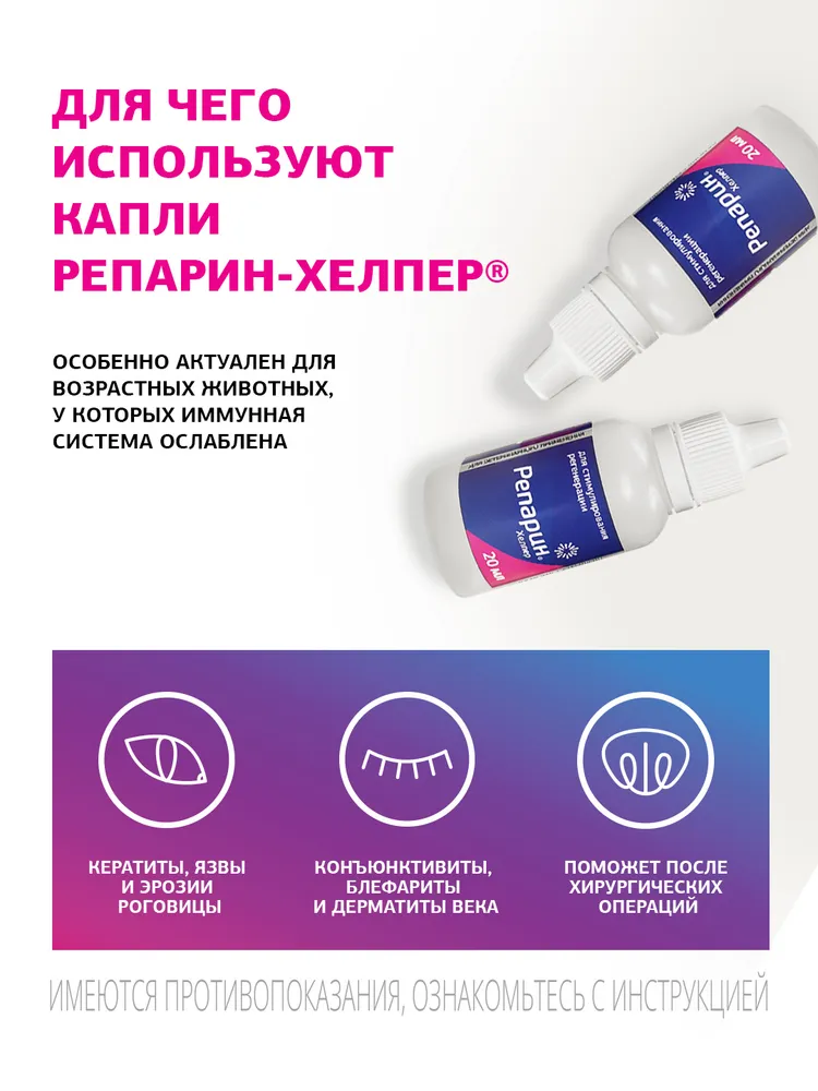 ВИДЕО: РЕАКЦИЯ СОБАКИ НА ГЛАЗНЫЕ КАПЛИНа видео на приеме ветеринарный врач-офтальмолог капает препарат Репарин-Хелпер® в глаз собаки.Посмотрите реакцию собаки: она не почувствовала боли или дискомфорта от капель! Использовать глазные капли Репарин-Хелпер® просто и безболезненно!Лекарство для животных Репарин-Хелпер® не вызывает раздражения, дискомфорта или слипания глаз. Препарат быстро впитывается.ОБЛЕГЧИТ СИМПТОМЫ СУХОГО ГЛАЗАЕсли Ваш питомец часто моргает или щурится, трет глаз лапой, или Вы наблюдаете покраснение глаз, густые выделения различных оттенков или тусклый вид глазных поверхностей, это могут быть признаки сухого кератоконъюктивита (синдром сухого глаза).Глазные капли Репарин-Хелпер могут помочь, обеспечивая:•\tИнтенсивное увлажнение: Репарин-Хелпер помогает поддерживать оптимальный уровень влаги, восстанавливая слезную плёнку.•\tАктивизацию регенерации: Репарин-Хелпер способствует восстановлению поврежденных тканей глаза, ускоряя процесс заживления после расчесывания или других повреждений.•\tСнижение симптомов сухости и дискомфорта: В результате противовоспалительного действия, улучшается состояние поверхности пораженного глаза, уменьшается ее сухость и раздражение.•\tНет побочных эффектов и аллергических реакций: Репарин-Хелпер безопасен для долгосрочного применения, не вызывает покраснения, отека век или выпадения шерсти вокруг глаз.Репарин-Хелпер может помочь облегчить симптомы сухого глаза, и в отличии от гелей и мазей, прозрачный раствор не оставляет следов, не пахнет и хорошо переносится животными, делая процесс лечения более комфортным, как для питомцев, так и для их владельцев.САМЫЙ ЭФФЕКТИВНЫЙ СТИМУЛЯТОР РЕГЕНЕРАЦИИ ДЛЯ ГЛАЗВетеринарный препарат Репарин-Хелпер® доказано работает! По использованию препарата Репарин-Хелпер® написано десятки научных статей, а в главном ветеринарном ВУЗе страны выпущено учебное пособие по его применению.Глазные капли используются на рынке с 2012 года, с их помощью мы вылечили более 50 000 животных. 97% владельцев довольны нашими каплями для глаз и пишут положительные отзывы.Читайте о нас в ветеринарных медиа.ПОДОЙДЕТ ЛИ РЕПАРИН-ХЕЛПЕР МОЕМУ ПИТОМЦУ?Лекарственное средство Репарин-Хелпер® поможет всем!• У нас есть опыт лечения глаз собак, кошек, лошадей, коров, свиней, кенгуру, тигров, медведей (включая знаменитого медведя Диксона из Московского Зоопарка), дельфинов, тюленей, рептилий и грызунов!• Мы сотрудничаем с главными зоопарками!• Если у вас есть экзотическое животное и ему нужна помощь, пишите нам, мы предоставим препарат бесплатно!ВАЖНАЯ ИНФОРМАЦИЯ!Ветеринарный препарат Репарин-Хелпер® требует холодильного хранения. При этом допускается его транспортировка при температуре до 23°С в течение 14 дней в обычных условиях.Капли для глаз можно применять в первые дни жизни, а также беременным и лактирующим животным!Хорошо сочетается с антибиотиками!Эффективно заменяет НПВС (вместе они не совмещаются)!