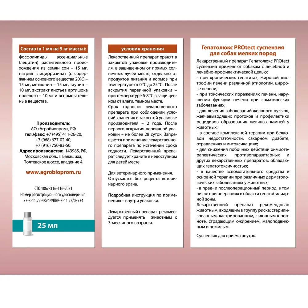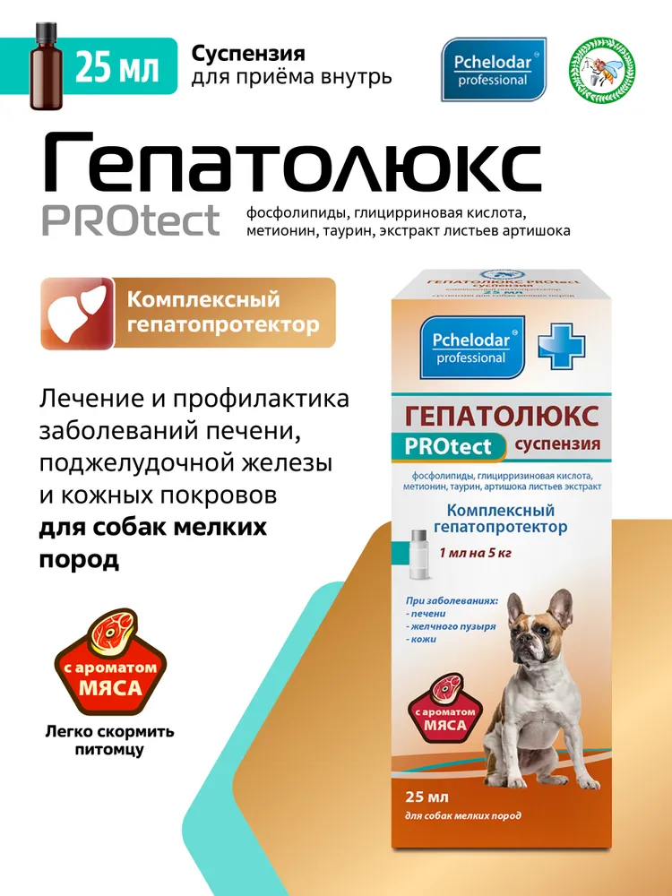 Гепатолюкс PROtect - это эффективное средство для лечения заболеваний печени у собак мелких пород. Специально разработанная формула суспензии обеспечивает быстрое и эффективное воздействие на органы пищеварения животного.Собаки мелких пород часто подвержены различным заболеваниям печени, которые могут привести к серьезным последствиям. Гепатолюкс PROtect поможет вашему питомцу избежать осложнений и вернуться к здоровой жизни.Специальный состав препарата содержит пчелодар, который обладает мощным противовоспалительным и регенерирующим действием. Это позволяет быстро восстановить функции печени и улучшить общее состояние животного.Не откладывайте лечение заболеваний печени у вашей собаки. Гепатолюкс PROtect - надежное средство, которое поможет вашему питомцу вернуться к полноценной жизни. Позаботьтесь о здоровье вашего четвероногого друга сегодня!Для лечения заболеваний печени и желчного пузыря у собак и кошек