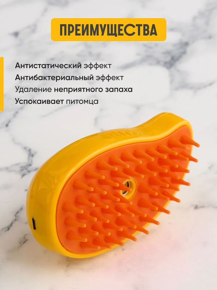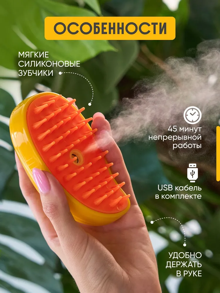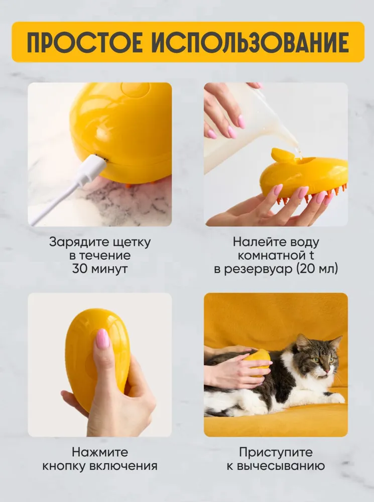 Аккуратно расчёсывайте шерсть питомца. Холодный пар мягко увлажняет и облегчает процесс вычёсывания. После использования выключите устройство и слейте остатки воды из резервуара.Простая и удобная конструкция делает уход за питомцем комфортным и эффективным!