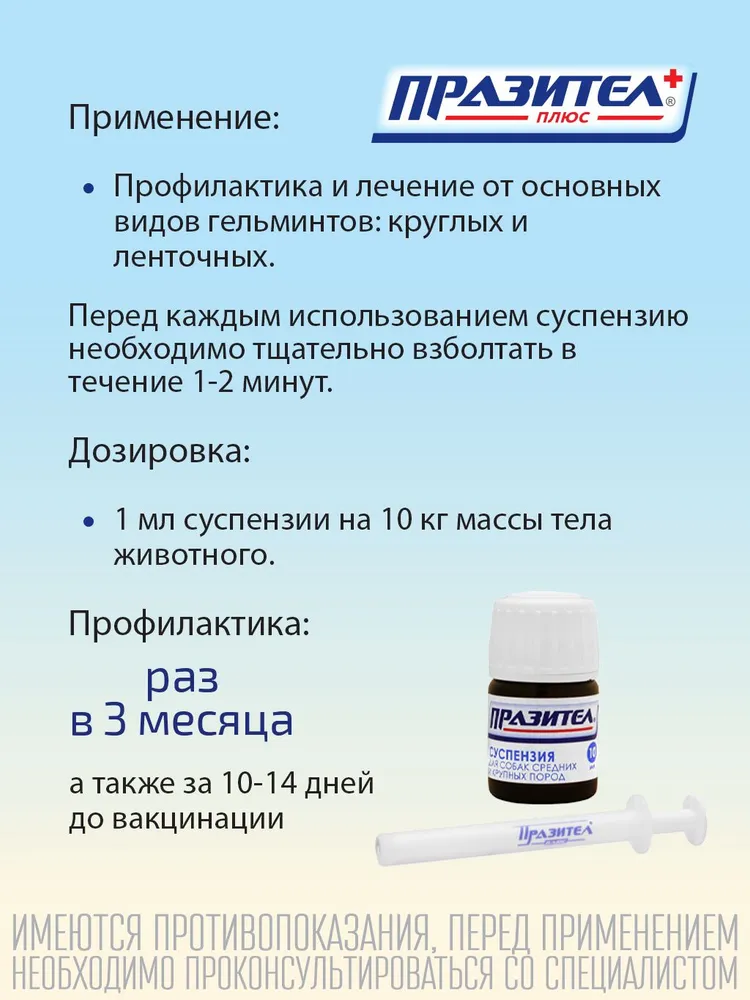 Празител плюс суспензию применяют собакам с лечебной и профилактической целью однократно в утреннее кормление с небольшим количеством корма или вводят с помощью шприца-дозатора из расчета 1 мл суспензии на 10 кг массы тела собаки. Препарат рекомендуется применять за 10 дней до вакцинации. Празител плюс суспензию применяют щенкам – с 2-х недельного возраста, беременным сукам – во второй половине беременности, кормящим сукам – через 3 недели после родов с осторожностью и под наблюдением ветврача. При сильной степени инвазии обработку необходимо повторить через 10 дней. Профилактическую дегельминтизацию необходимо проводить один раз в 3 месяца.Противопоказания