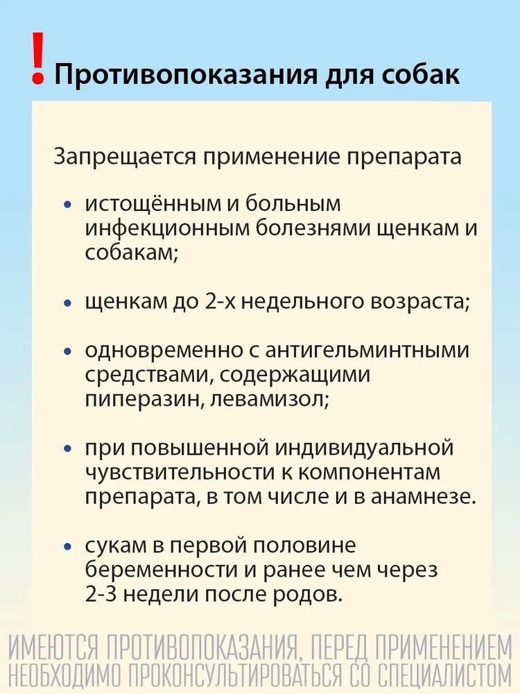 Препарат не рекомендуется истощенным и больным инфекционными болезнями животным.Не применять препарат одновременно с антигельминтными средствами, содержащими пиперазин.Флакон – 10 мл.