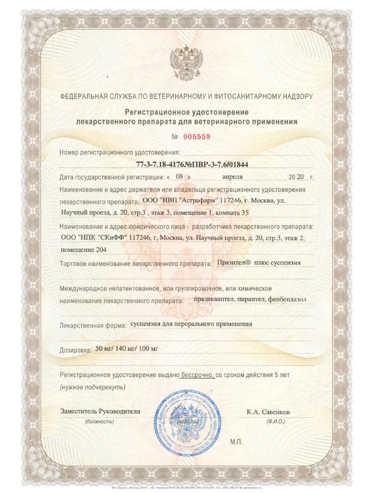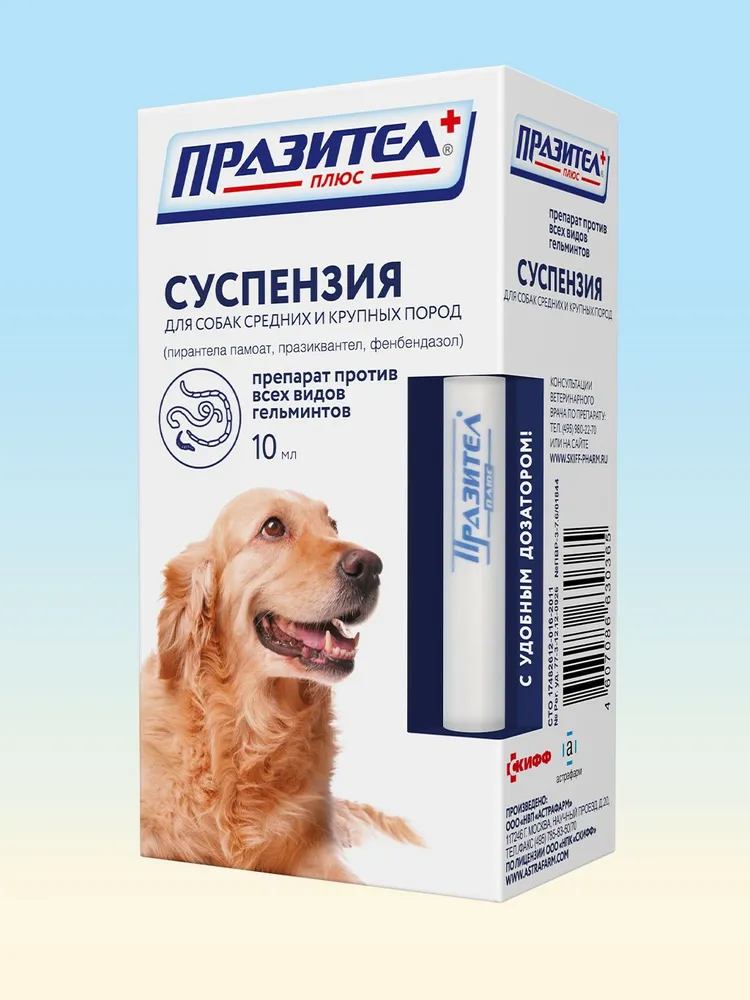 Празител плюс для собак средних и крупных пород – антигельминтный препарат для собак в форме суспензии. Предназначен для лечения и профилактики заражения основными видами круглых и ленточных глистов. В качестве действующих веществ в своем составе содержит Пирантела памоат, Фенбендазол и Празиквантел.Назначение: профилактика и лечение нематодозов и цестодозов у собак.Состав1 мл препарата содержит:Празиквантел – 50 мг