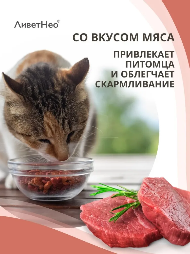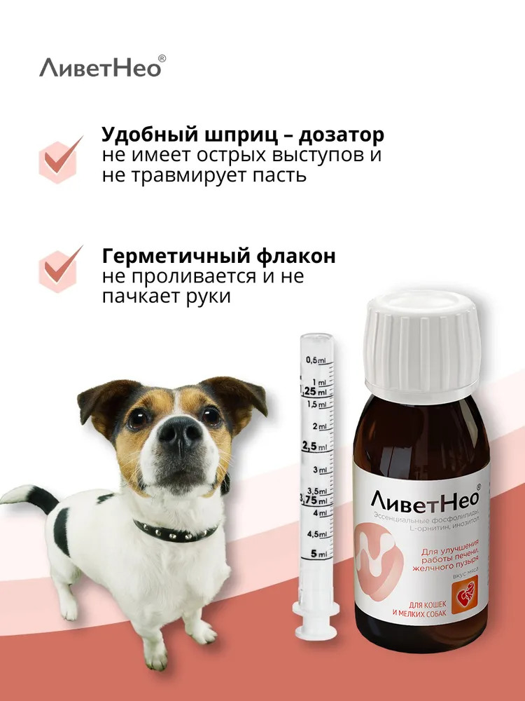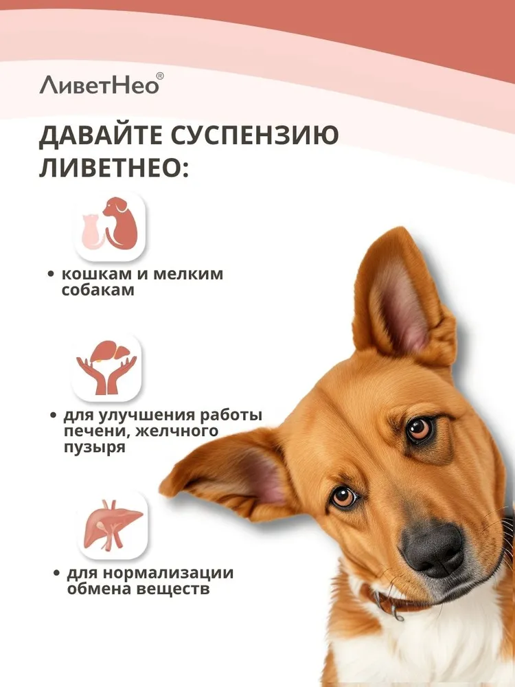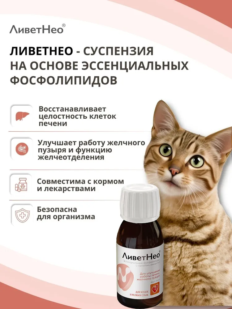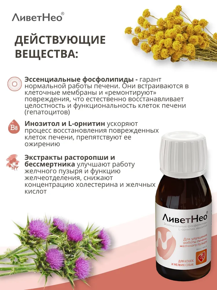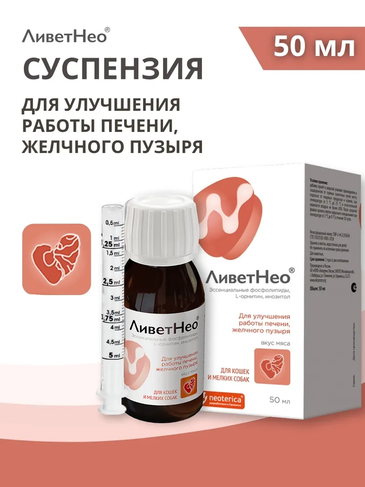 Нео – кормовая добавка для нормализации и улучшения работы печени, желчного пузыря на основе эссенциальных фосфолипидов с приятным ароматом и вкусом мяса.Используйте для собак и кошек:Применяют суспензию перорально, задают питомцу индивидуально с небольшим количеством корма или вводят принудительно на корень языка с помощью шприца-дозатора из расчета кошкам – 1 мл на 5 кг массы тела, собакам – 1 мл на 10 кг массы тела животного, 2 -3 раза в сутки. Курс применения – 3 - 5 недель. При необходимости курс повторяют через 2 – 3 недели.Состав в 1 мл суспензии:Эссенциальные фосфолипиды – 4,5 - 5,5 %L - орнитин – 3,6 – 4,4 %Экстракт расторопши сухой – 1,35 – 1,65%Экстракт бессмертника сухой - 1,35 – 1,65%Инозитол – 1,21 – 1,49%Ливет