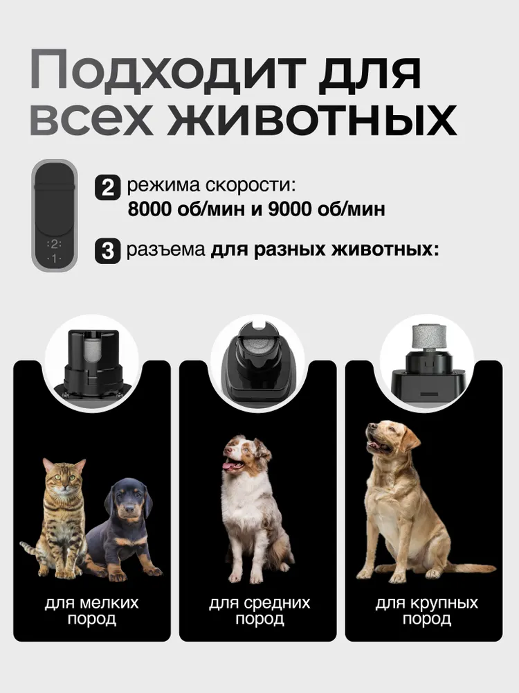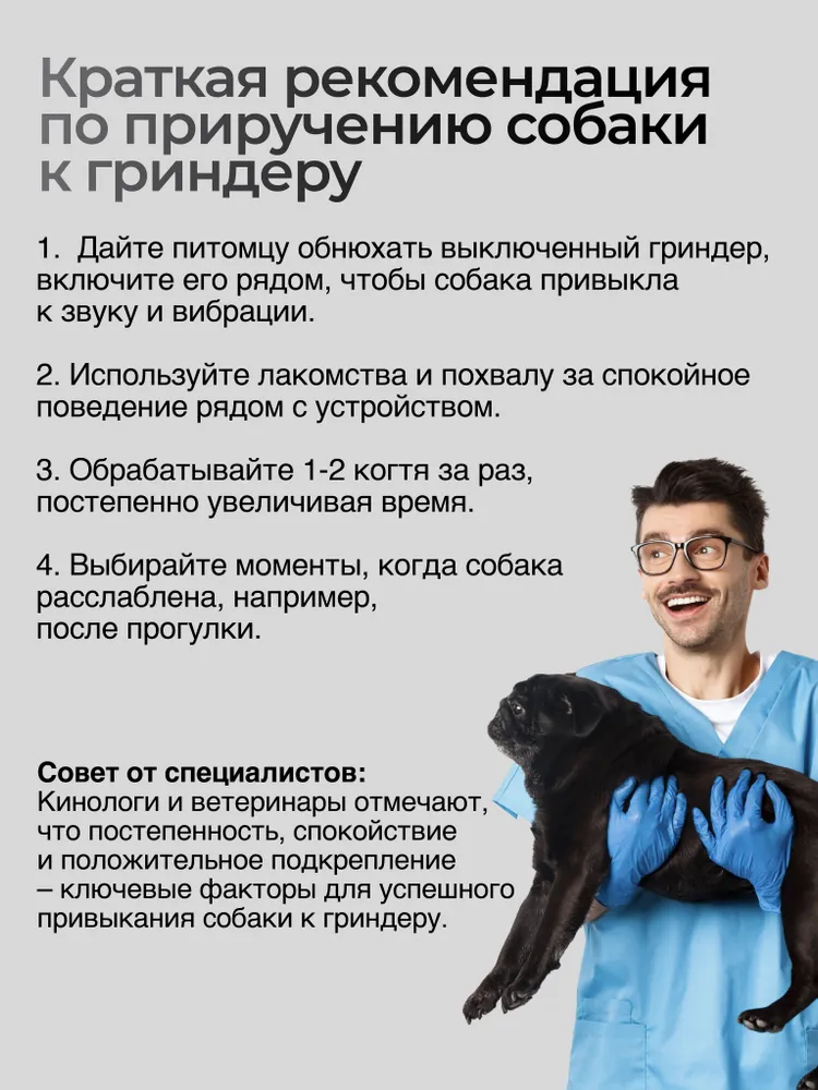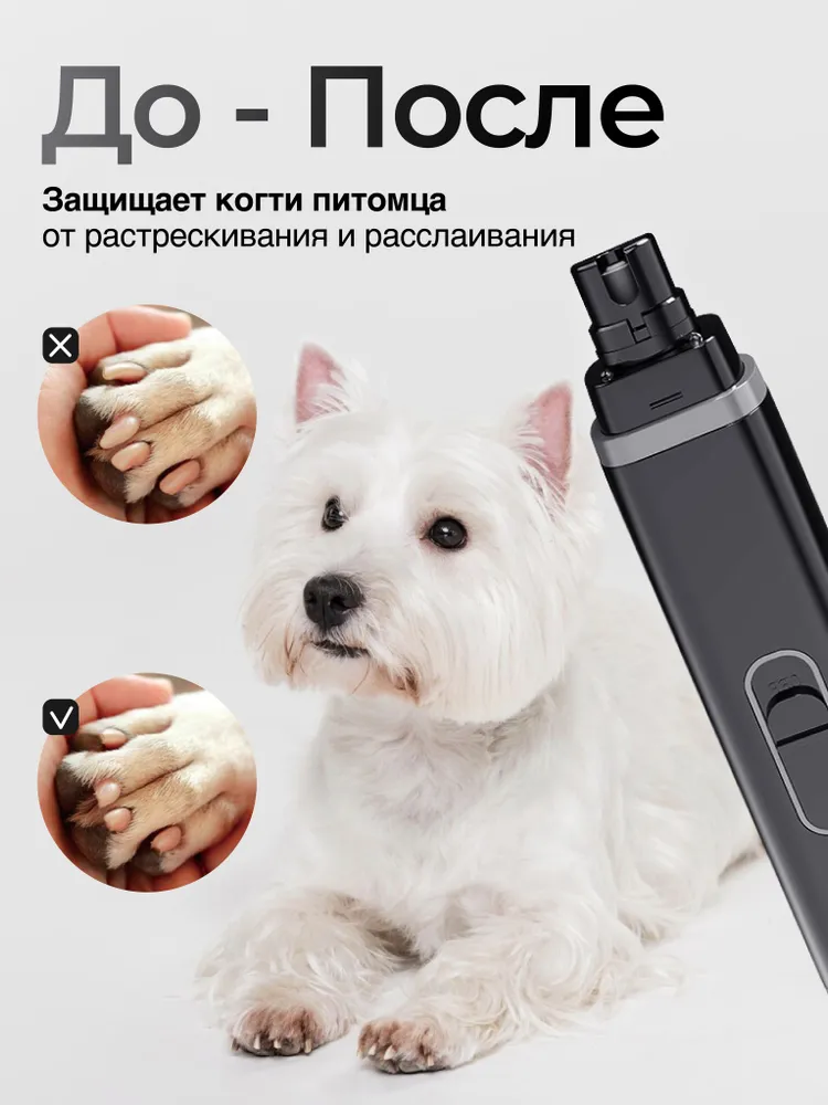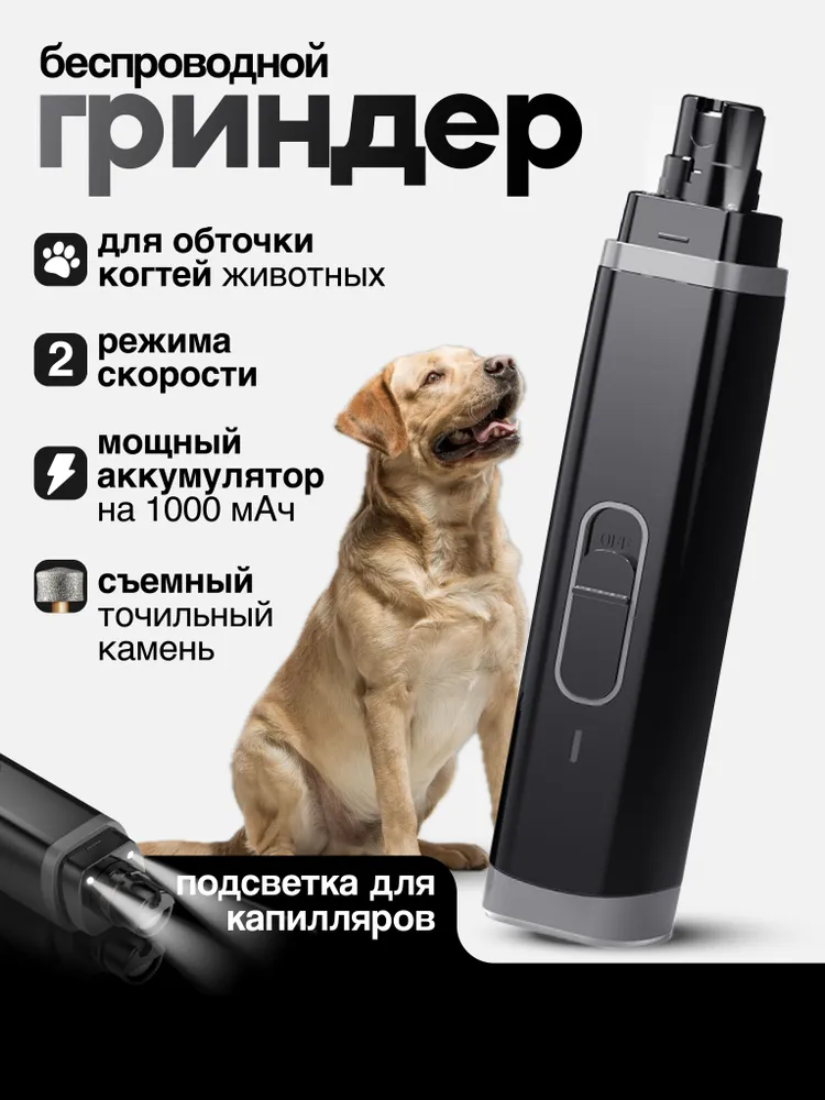 Идеальное решение для стрижки когтей у ваших любимцев! Наш гриндер для когтей представляет собой надежный и безопасный инструмент, который подходит как для кошек, так и для собак. Это та же когтерезка для кошек и собак, но безопаснее, так как подразумевает аккуратную обточку когтей животного. Безопасный инструмент удобен в использовании, не ломает и не стрижет когти, позволяет безболезненно, аккуратно осуществлять груминг и уход в домашних условиях. С его помощью вы сможете легко и быстро подстричь коготки своего питомца, не повредив нежную кожу. Два встроенных ярких светодиодных датчика позволяют точно увидеть анатомический срез когтя и не повредить сосуды и нервные окончания. Подходит как для мелких, так и для крупных пород собак. Забудьте о стрессе и тревоге перед процедурой - с нашим гриндером ваш питомец будет чувствовать себя комфортно и спокойно. Закажите наш гриндер для когтей прямо сейчас и обеспечьте своему питомцу заботу и комфорт, которые он заслуживает!