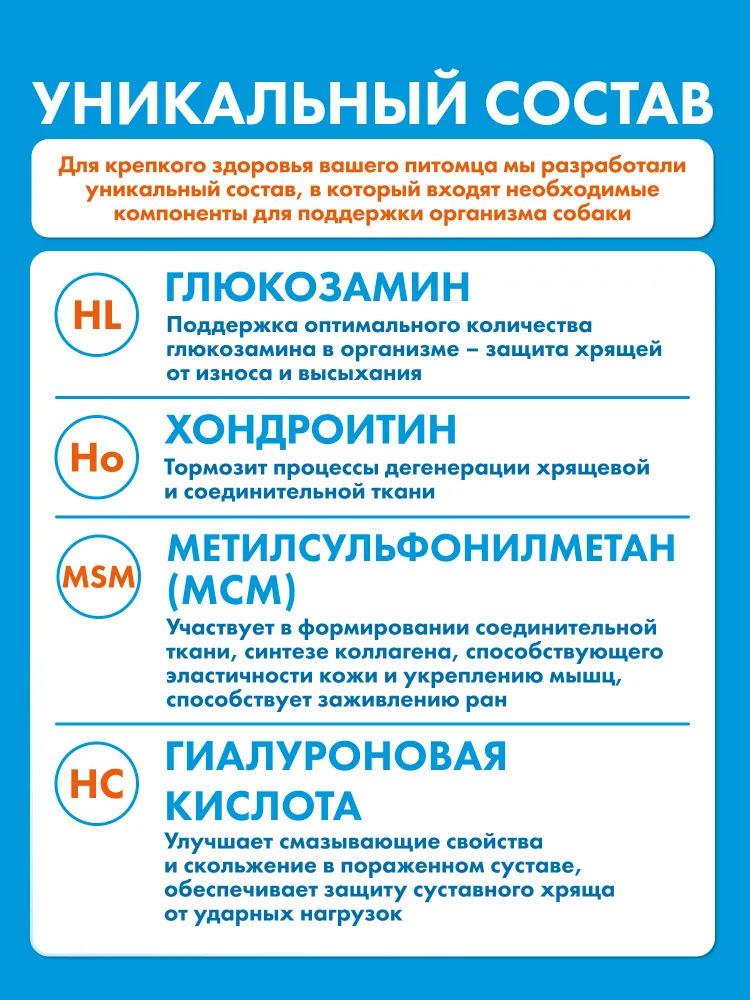 Комплекс Joint Care for dog обеспечивает эластичность и прочность соединительных тканей сухожильно-связочного и суставного аппарата, содействует его восстановлению и повышает сопротивляемость механическим нагрузкам, позволяет эффективно продуцировать медленно растущие сухожилия и связочные ткани у щенков, у взрослых собак поддерживает метаболизм суставных хрящей, восстанавливает связки и сухожилия.Глюкозамин – моносахарид, содержится в соединительной ткани опорно-двигательного аппарата, делает ее прочнее и эластичнее, это строительный материал для хрящей. Поддержка оптимального количества глюкозамина для суставов в организме – защита хрящей от износа и высыхания.Хондроитин - замедляет резорбцию костной ткани и снижает потерю Ca2+. Улучшает фосфорно-кальциевый обмен в хрящевой ткани, ускоряет процессы её восстановления, тормозит процессы дегенерации хрящевой и соединительной ткани. Подавляет активность ферментов, вызывающих поражение хрящевой ткани, стимулирует синтез гликозаминогликанов, способствует регенерации суставной сумки.Метилсульфонилметан (МСМ)участвует в формировании соединительной ткани, синтезе коллагена, способствующего эластичности кожи и укреплению мышц, способствует заживлению ран.Гиалуроновая кислота - одной из причин заболевания хрящей является недостаток внутрисуставной смазки. ГК улучшает смазывающие свойства и скольжение в пораженном суставе, обеспечивает защиту суставного хряща от ударных нагрузок.Составляющие комплекса легко усваивается и быстро встраивается в поврежденные ткани.Без ароматизаторов, не содержит ГМО, без усилителей вкуса, без красителей и консервантов. Разработано совместно с ветеринарными врачами