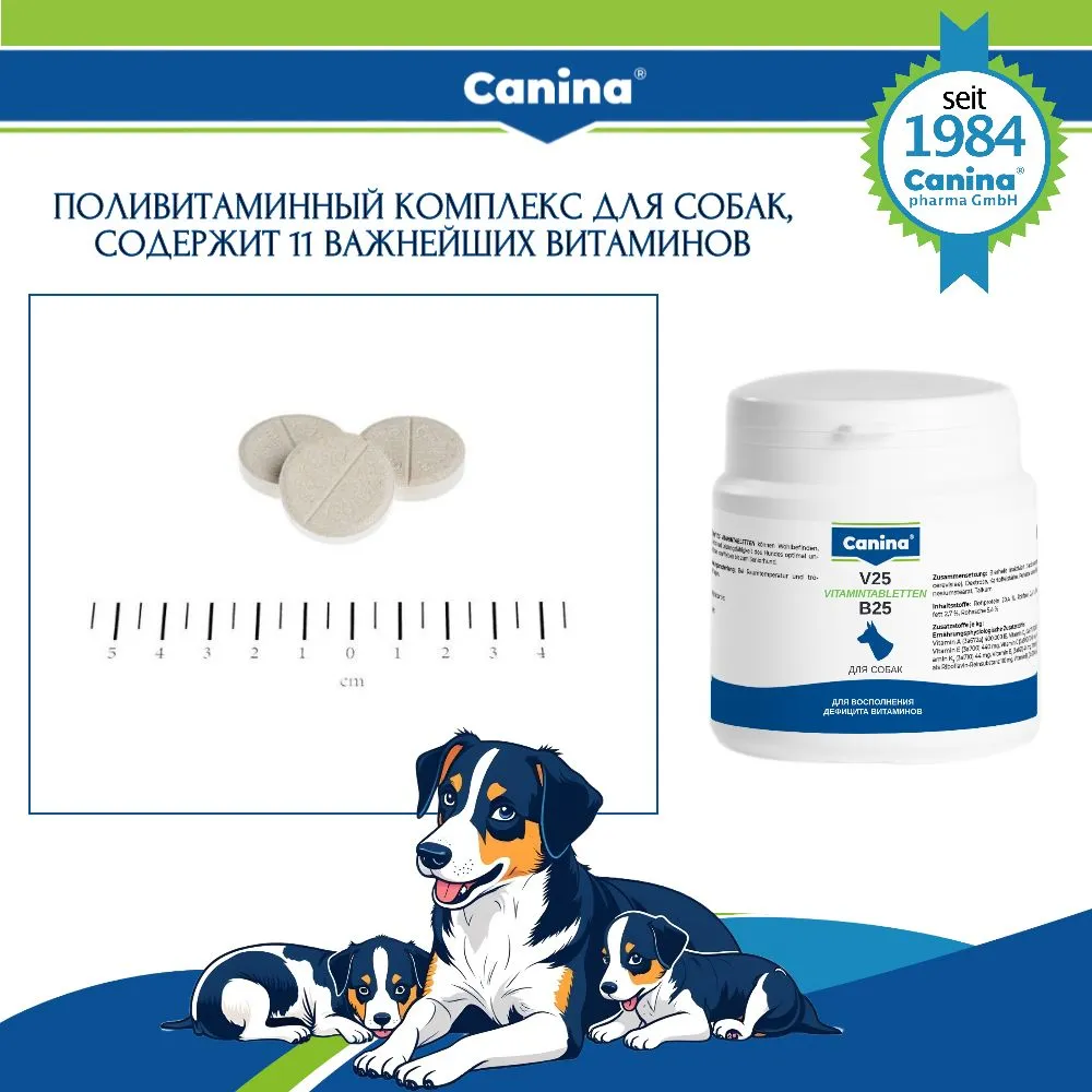 Canina (Канина) V25 – витамины для взрослых собак, 30 таб.💛 Пищевой дефицит витаминов, помимо прочих симптомов, может привести к тусклости шерсти, нервозности, нарушениям роста и потере аппетита. Чтобы компенсировать такой дефицит питательных веществ, были специально разработаны ВИТАМИННЫЕ ТАБЛЕТКИ Canina® V25. Содержит 11 жизненно важных витаминовV25 ВИТАМИННЫЕ ТАБЛЕТКИ:🔸 стимулирует кроветворение🔸 поддерживает метаболизм протеина и жира🔸 особенно подходит для беременных и кормящих сук🔸 поддерживает организм во время фазы роста и во всех стрессовых ситуациях🔸 компенсирует недостаток питательных веществ, связанный с питанием🔸 поддерживает иммунную систему🔸 комплекс витаминов группы В: поддерживает здоровую нервную систему, углеводный и белковый обмен, образование крови, рост, жировой обмен, защита кожи и слизистых оболочек🔸 Витамин D: способствует усвоению кальция у собаки, регулирует накопление кальция и фосфора в костях🔸 Биотин: для здоровой кожи, сильной и блестящей шерсти, оптимальной пигментации шерсти, мочки носа и подушечек лап, крепких и прочных когтей🔸 Витамин А: наращивание и регенерация кожи и слизистых оболочек🔸 Витамин Е: контроль углеводного и гормонального обмена🔸 Витамин С: поддерживает формирование соединительной ткани, костей и хрящей👩⚕️ Совет ветеринара:"Canina V25 — мой выбор для поддержания иммунитета и отличного внешнего вида у взрослых собак. Использую в клинике в период восстановления после болезней и операций."Состав. Инструкция по применению.🧬 Состав:Действующие вещества: инактивированные дрожжи Saccharomyces cerevisiae (39-41%); вспомогательные вещества: декстроза (39-41%), крахмал (11-13%), средство для таблетирования (магния стеарат, тальк, осажденная кремнекислота) - до 100%В 1 кг добавки содержится: витамин A (369600 - 510400 МЕ), витамин D3 (8400 - 11600 МЕ), витамин Е (370 - 510 мг), витамин B1 (37 - 51 мг), витамин B2 (92 - 128 мг), витамин B6 (37 - 51 мг), витамин В12 (187 - 253 мкг), витамин С (913 - 1287 мг), витамин K3 (37 - 51 мг), биотин (16600 - 23400 мкг), кальций-D-пантотенат (183 - 257 мг), никотинамид (548 - 772 мг), фолиевая кислота (8,5 - 11,5 мг).💪Гарантируемые показатели: сырой протеин (17,0-21,0%); сырая зола (5,5-7,3%); содержание влаги - не более 6,0%.Рекомендации по кормлению на собаку в сутки:1 таблетка на 10 кг массы тела, макс. 3 таблетки.Во время беременности и лактации и в периоды высоких физических нагрузок доза должна быть удвоена.🦴 Преимущества:💪 Укрепление иммунной системы и жизненного тонуса✨ Улучшение состояния кожи и блеска шерсти🧠 Поддержка нервной системы и обмена веществ🐾 Подходит в период стресса, беременности, роста и восстановления🌿 Без искусственных красителей и ароматизаторов💎 Качество Canina pharma GmbH (Германия)💌 Добавьте в корзину прямо сейчас — пусть каждый день вашей собаки будет наполнен здоровьем, энергией и яркой шерстью!