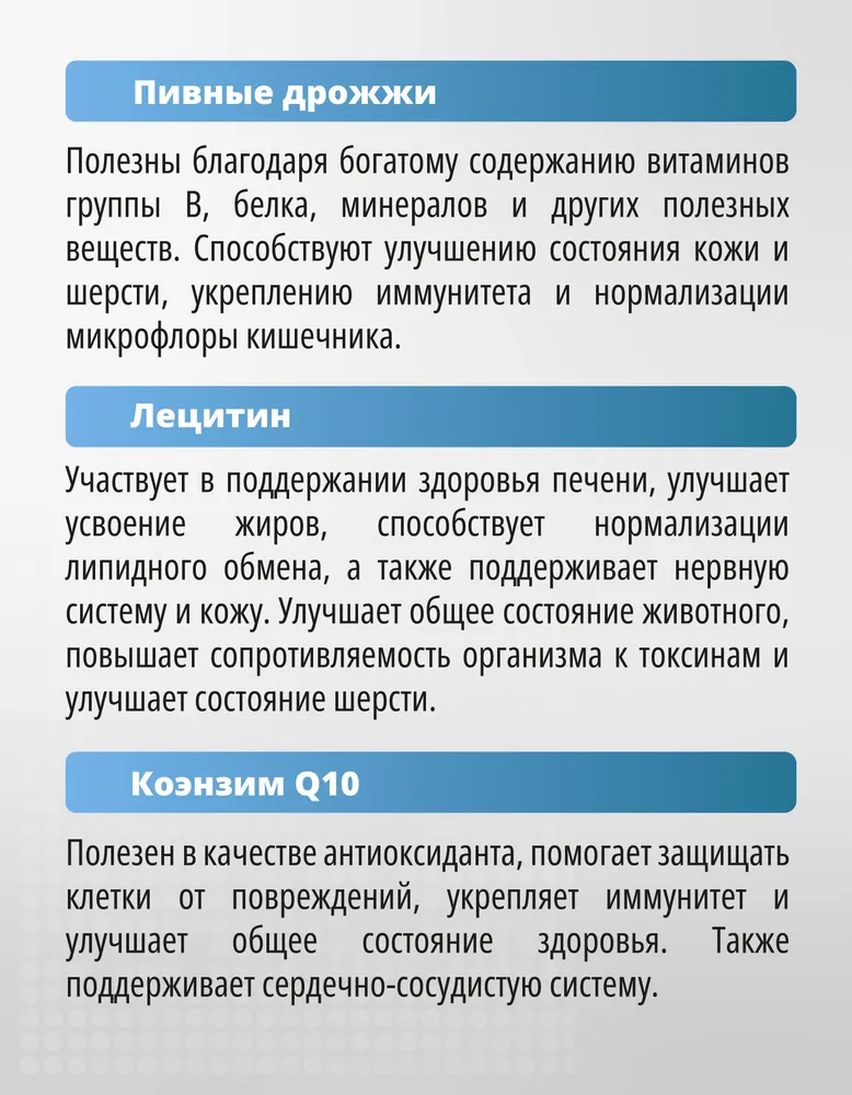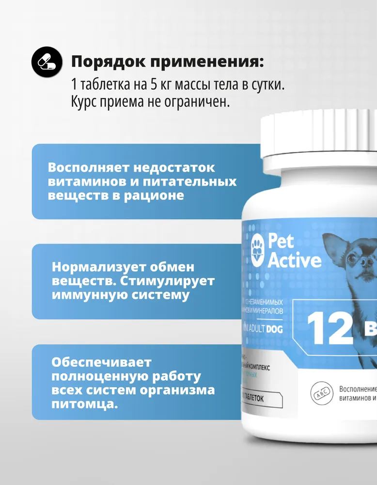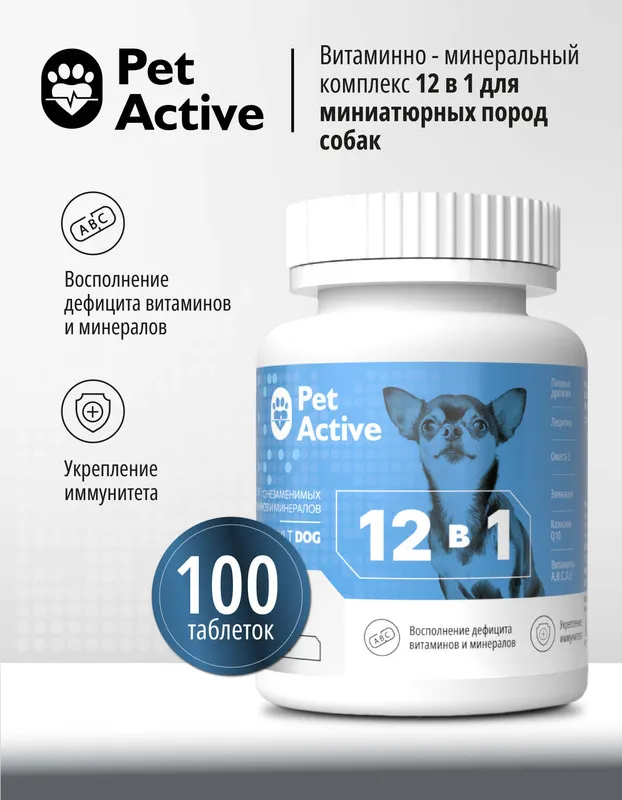 Витаминно - минеральный комплекс PetActive для кошек и собак – создан для полноценного ухода за здоровьем питомцев, содержит необходимые витамины и минералы, которые помогают сохранять бодрость и отличное самочувствие каждый день. Комплексный подход: необходимые витамины и минералы в одной формуле.\nЗдоровье питомцев: поддерживает иммунитет, здоровье кожи, шерсти, суставов и сердца, зубов и костей.\nУдобство применения: подходит как для кошек, так и для собак разных пород. \nБез использования искусственных красителей и ароматизаторов.