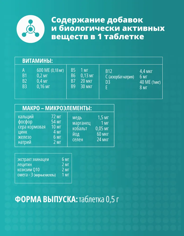 кальций - 72 мг - фосфор - 54 мг - сера - кормовая 10 мг - цинк - 4 мг - железо - 6 мг - натрий - 2 мг - медь - 1, 5 мг - марганец - 1 мг - кобальт - 0, 05 мг - йод - 60 мкг - селен - 24 мкг. Экстракт эхинацеи - 6 мг - лецитин - 2 мг - коэнзим Q10 - 2 мг - омега-3 жирные кислоты - 1 мг