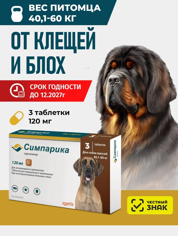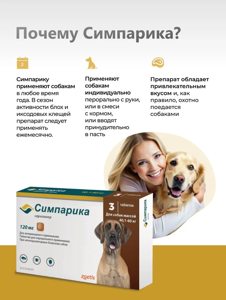 Симпарика относится к группе инсектоакарицидных препаратов системного действия. Входящий в состав препарата сароланер – соединение изоксазолиновой группы, активно в отношении блох, иксодовых, саркоптоидных, псороптоидных и демодекозных клещей, паразитирующих на собаках. Сароланер действует в нервно-мышечных синапсах членистоногих и подавляет функцию рецептора нейромедиатора, гамма-аминомасляной кислоты (ГАМК) и глутаматного рецептора, вызывая неконтролируемую нейромышечную активность, приводящую к гибели насекомых и клещей. После перорального введения сароланер быстро всасывается в желудочно-кишечном тракте (биодоступность составляет >85%), поступает в системный кровоток, достигая максимальной концентрации в плазме менее чем через 3 часа, проникает в большинство органов и тканей, практически не метаболизируется, выводится из организма в неизмененной форме, преимущественно с желчью и фекалиями, период полувыведения составляет 10-12 суток. После перорального введения таблетки действие препарата сохраняется на протяжении не менее 5 недель (35 дней). Препарат вызывает гибель блох, паразитирующих на собаке, не позже, чем через 3 часа, а иксодовых клещей – не позже, чем через 8 часов после введения лекарственного препарата. Гибель блох происходит до откладки яиц, что профилактирует контаминацию помещений яйцами и личинками. Симпарика снижает риск передачи возбудителей бабезиоза (Babesia canis), болезни Лайма (Borrelia burgdorferi) и анаплазмоза (Anaplasma phagocytophilum), вследствие уничтожения иксодовых клещей до передачи возбудителей вышеуказанных болезней. Симпарика по степени воздействия на организм относится к веществам малоопасным (4 класс опасности по ГОСТ 12.1.007) со слабо выраженными кумулятивными свойствами, в рекомендуемой дозе не обладает мутагенной, канцерогенной, эмбриотоксической и тератогенной активностью.Показания