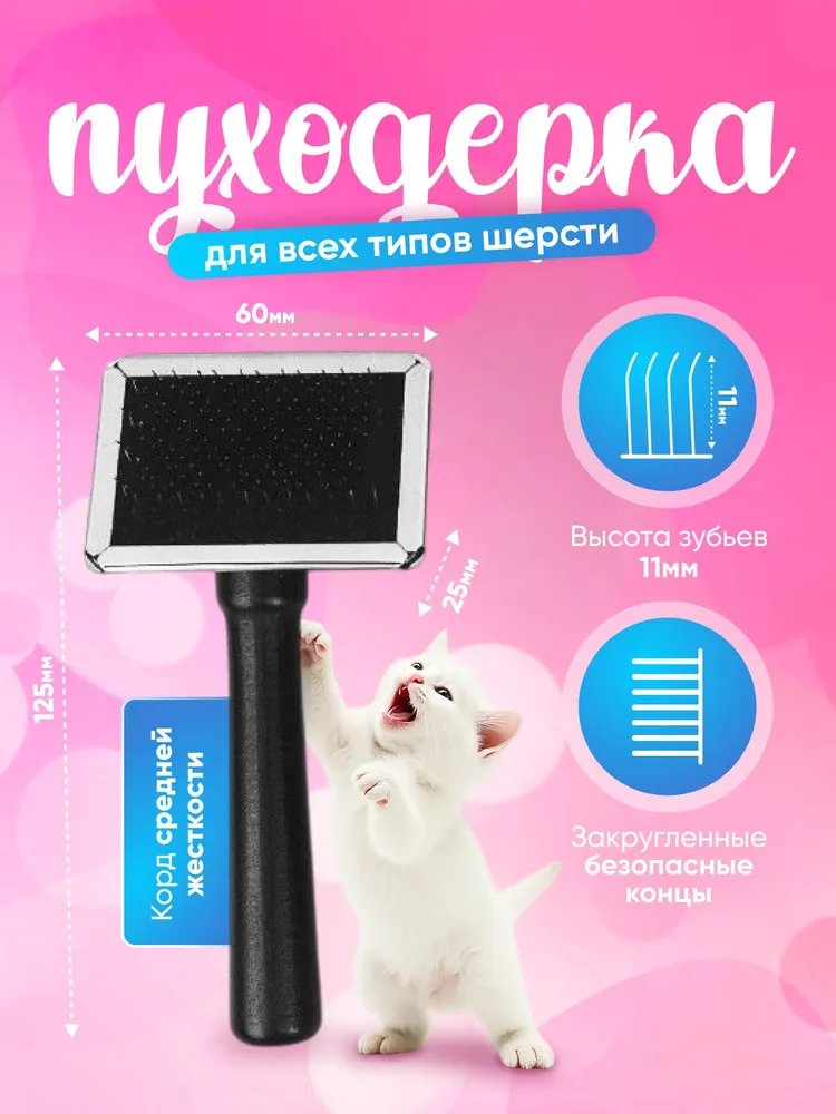 Щетина пуходерки выполнена из высококачественной нержавеющей стали. За счет этого она очень бережно придает шерсти питомца ухоженный вид, не повреждая структуру остевого волоса, очищает от загрязнений, избавляет от колтунов и спутывания. Зубчики загнутой формы прекрасно справляются с функцией вычесывания.Расческа-щетка