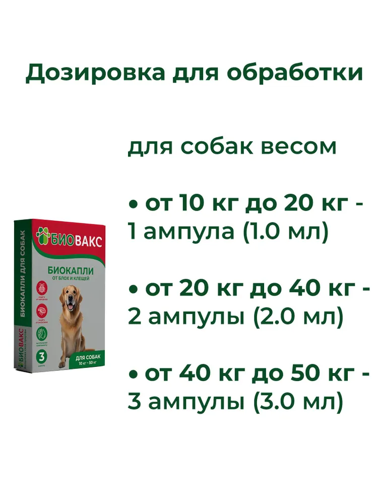 Средство не является лекарственным препаратом и не требует ветеринарной лицензии для продажи. Рекомендовано как поддерживающее и профилактическое средство в тёплое время года и в период активности клещей и насекомых.Инструкция по применению:Перед использованием внимательно прочитайте инструкцию (на внутренней стороне упаковки).Откройте ампулу-пипетку, предварительно встряхнув её.Раздвиньте шерсть питомца и нанесите капли точечно на кожу в области холки или шеи (в местах, недоступных для вылизывания).Норма расхода: – собаки от 10 до 20 кг — 1 пипетка (1 мл); – собаки от 20 до 40 кг — 2 пипетки (2 мл); – собаки от 40 до 50 кг — 3 пипетки (3 мл).Обработка проводится 1 раз в 30 дней. Остаток пипеток можно использовать для повторной обработки. При сильной заражённости животного паразитами рекомендуется предварительно вымыть его шампунем «Биовакс» от блох и клещей с экстрактом далматской ромашки и маслом лаванды.Меры предосторожности:Не использовать для щенков младше 12 недель.Не применять на больных, ослабленных и выздоравливающих животных без консультации ветеринара.Избегать попадания в глаза и на слизистые оболочки.Форма выпуска: Упаковка содержит 3 пипетки по 1 мл. Удобна в применении, подходит для хранения в дорожной аптечке.Кому подойдут капли Биовакс?Владельцам собак, предпочитающим натуральные составы