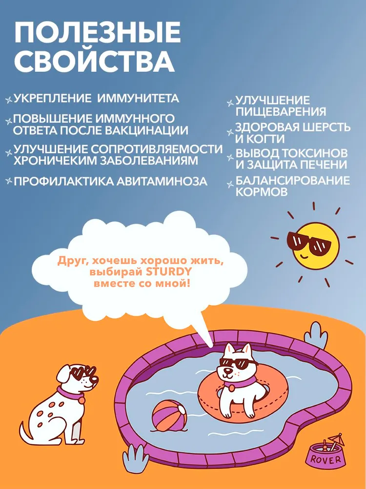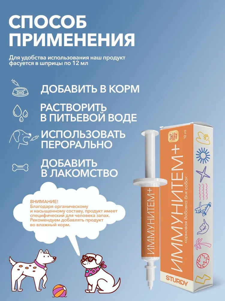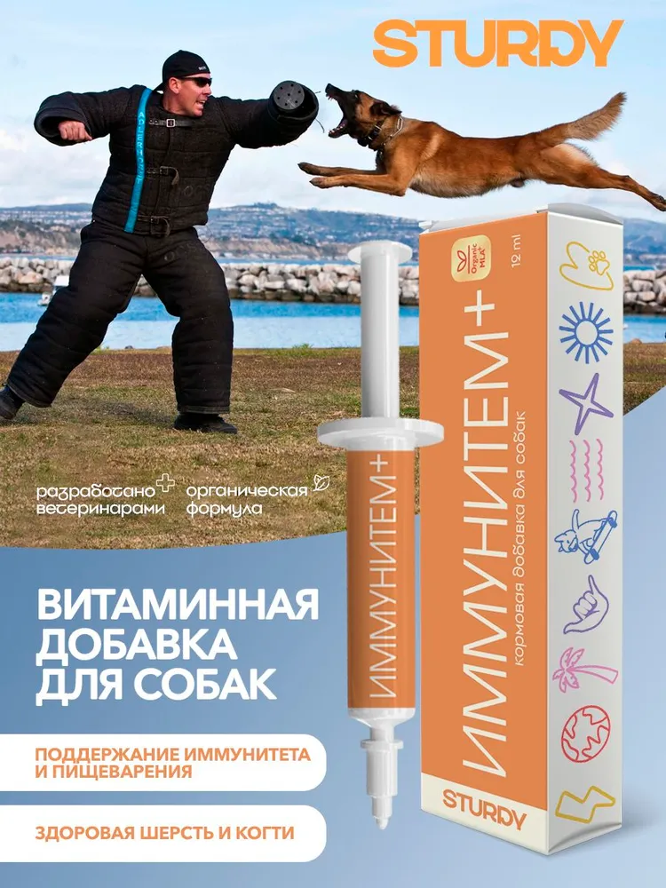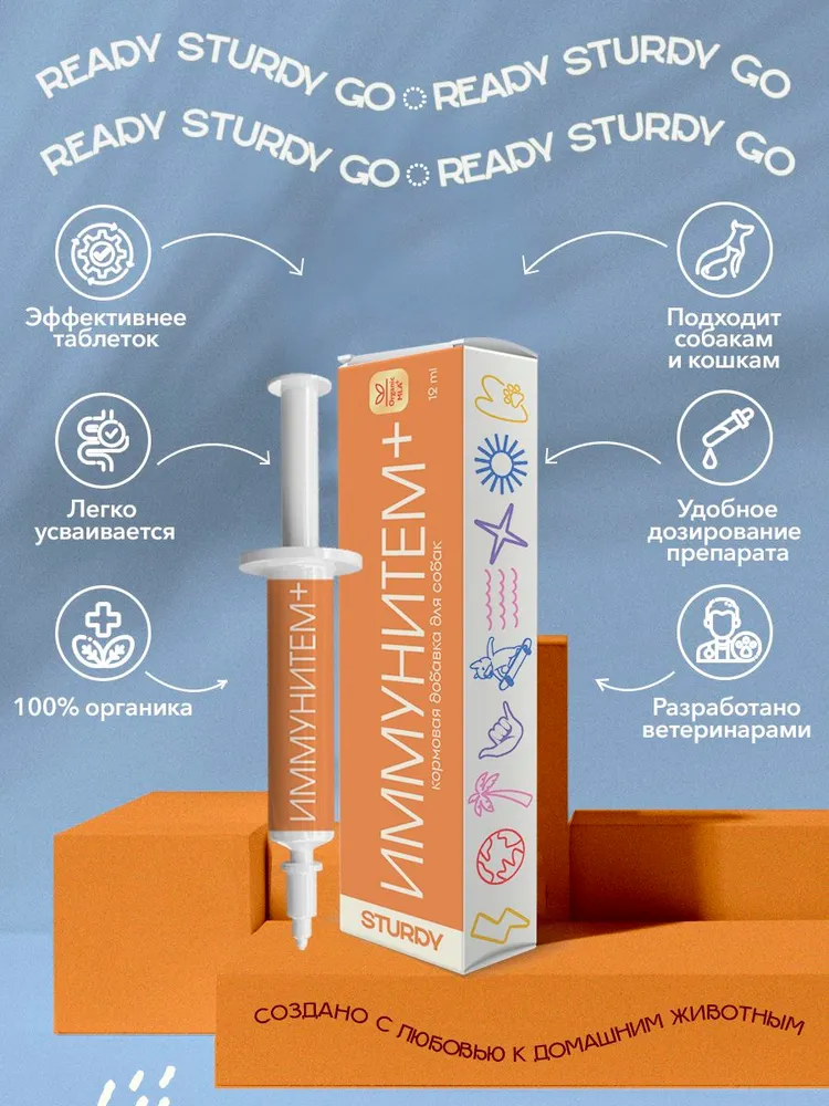 ИММУНИТЕМ+ от STURDY - это уникальная жидкая кормовая добавка, разработанная ветеринарами специально для укрепления иммунной системы собак и щенков всех пород и поддержания здоровья. Этот витаминный комплекс содержит в себе натуральные компоненты, способствующие повышению защитных функций организма вашего питомца. Выбор ИММУНИТЕМ+ от STURDY - это важный шаг к укреплению здоровья вашего любимца.Кормовая добавка выполняет функции: Укрепление иммунитета, Восстановление баланса нормофлоры кишечника, Профилактика авитаминоза, Улучшение сопротивляемости хроническим заболеваниям, Здоровая шерсть и зубы, Улучшение метаболизма