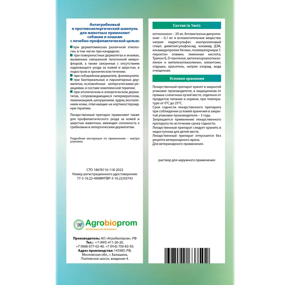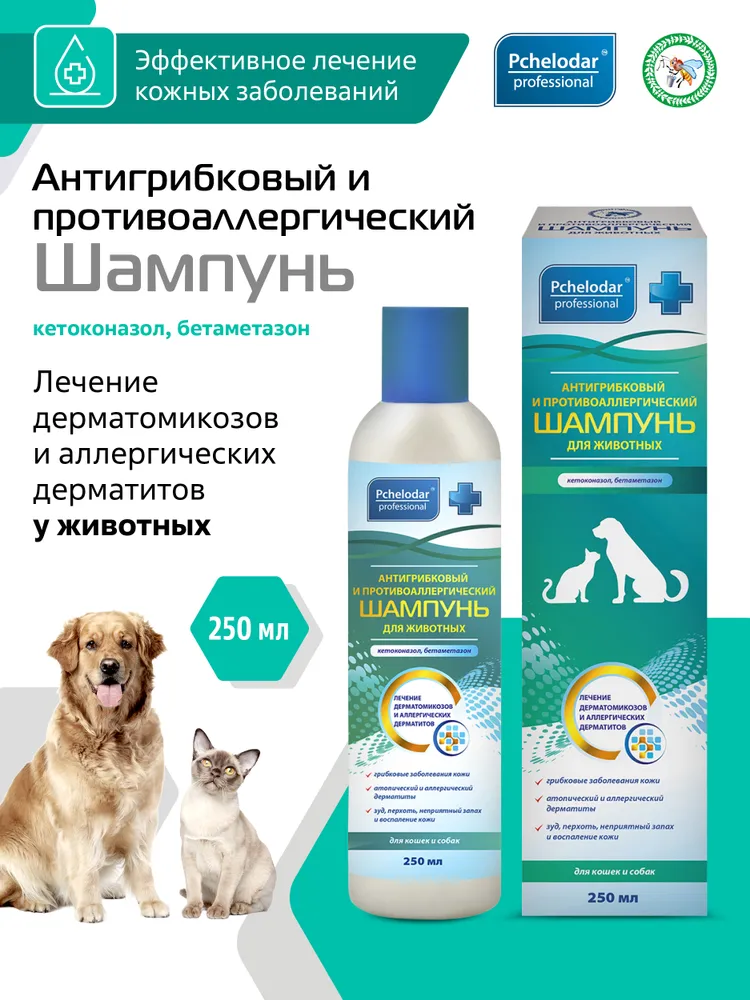 Пчелодар - это незаменимый помощник в уходе за вашим питомцем. Благодаря уникальной формуле, разработанной специально для животных, шампунь обеспечивает надежную защиту от грибковых инфекций и аллергических реакций.Специально подобранные компоненты шампуня обладают противогрибковым и противоаллергическим действием, помогая избавиться от раздражения и зуда на коже животного. Шампунь обладает увлажняющим и успокаивающим эффектом, делая шерсть вашего питомца мягкой и блестящей.Этот шампунь идеально подходит для кошек и собак любых пород и возрастов. Прост в применении: нанесите небольшое количество шампуня на влажную шерсть, массируйте до образования пены, затем тщательно смойте водой. Повторите процедуру при необходимости.Не забывайте о заботе о здоровье вашего питомца. Позаботьтесь о его коже и шерсти с помощью шампуня Пчелодар. Пусть ваш любимец будет здоровым и счастливым каждый день!Гигиенический лосьон для ухода за кожей собак и кошек