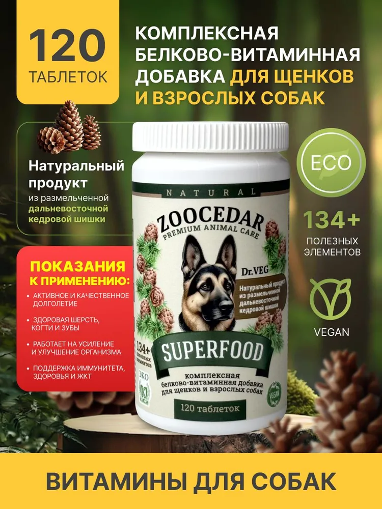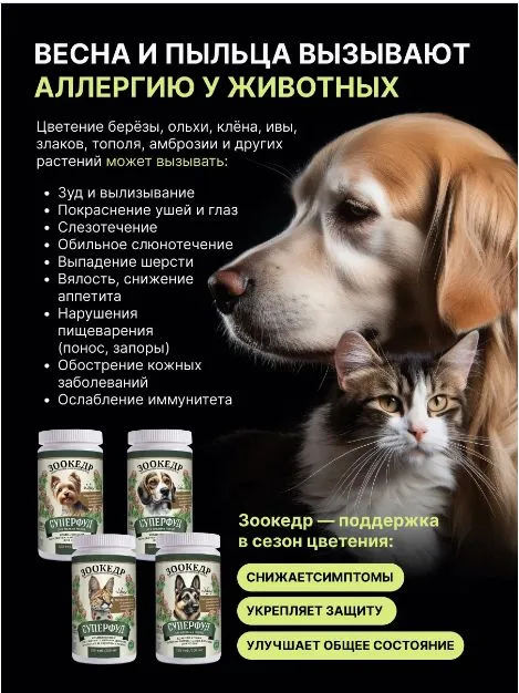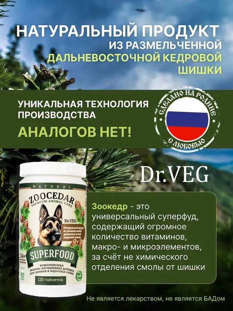 Зоокедр — инновационный суперфуд для собак, созданный по уникальной нехимической технологии переработки дальневосточного кедра, не имеющий аналогов по составу и способу производства.Уникальность продукта в том, что Зоокедр производится без использования химии. Продукт содержит 134 микро- и макроэлемента, включая витамины (A, E, группы B, D, C), аминокислоты, жирные кислоты и биоактивные вещества, которые обеспечивают комплексную поддержку организма.Витамины легко усваиваются и подходят для регулярного использования как для щенков, так и для взрослых питомцев, что делает их идеальным выбором для заботливых владельцев.Рекомендуем наши комплексные витамины для кошек
