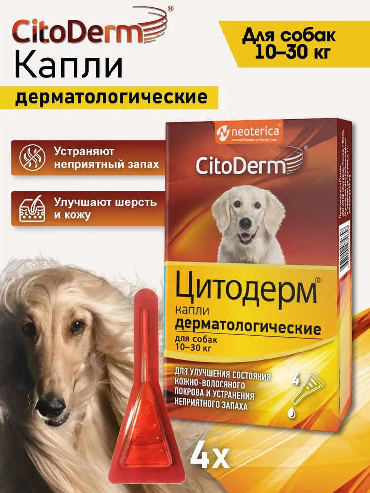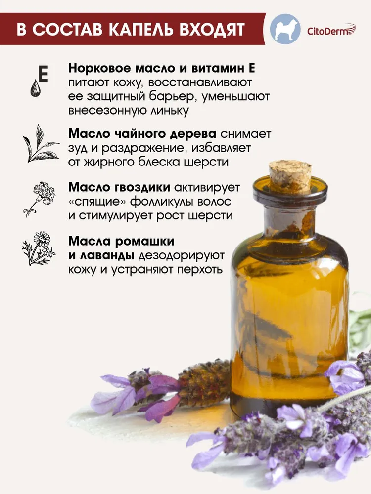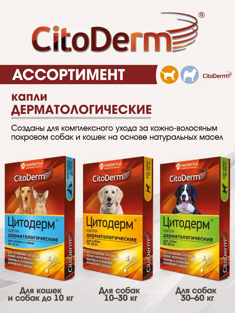Мы часто сталкиваемся с дерматологическими проблемами питомцев: постоянная линька, плохое качество шерсти, шелушение на коже или запах «псины». В этих случаях нашим кошкам и собакам нужен специальный уход. Решить проблемы помогут дерматологические капли CitoDerm!Питательные масла в дерматологических каплях CitoDerm глубоко проникают в кожу, накапливаются с волосяных фолликулах и сальных железах и обеспечивают непревзойденный и долгосрочный результат.CitoDerm капли дерматологические решают проблемы кожи и шерсти:✔ Уменьшают линьку✔ Стимулируют рост шерсти✔ Увлажняют кожу и избавляют от перхоти✔ Снимают зуд и раздражение✔ Устраняют неприятный запах «псины»Используйте собакам:• С сильной линькой• С тусклой, блеклой, редкой шерстью• Для снятия симптомов аллергии• С неприятным запахом от шерсти
