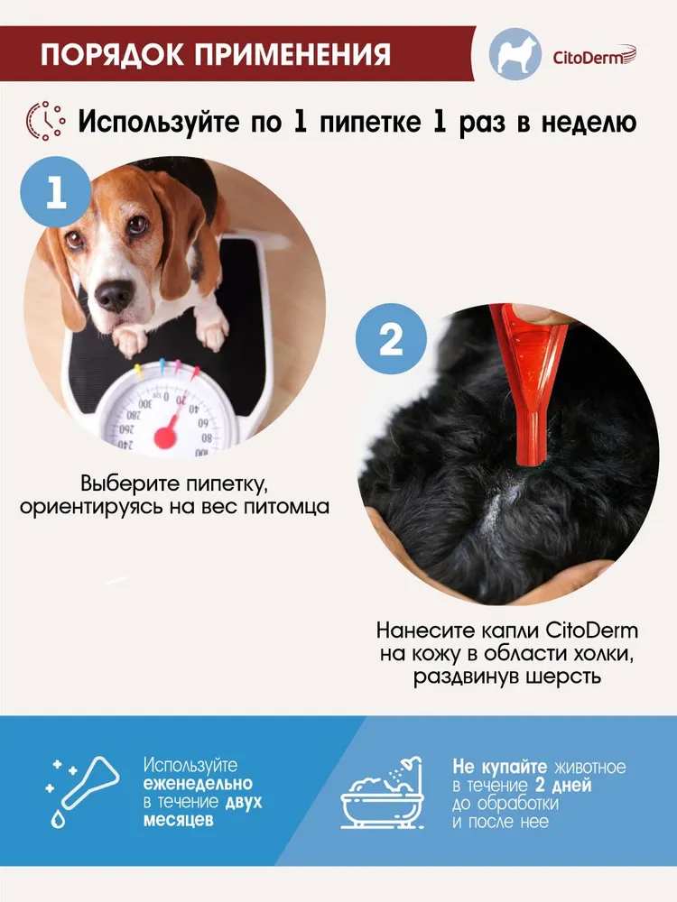 Способ применения:• Нанесите средство на холку питомца, в 2–4 местах, недоступных для слизывания.• Используйте по 1 пипетке 1 раз в неделю• Оптимальный курс применения 2 месяца• Для закрепления результата продолжите использовать средство 1 раз в 2 недели