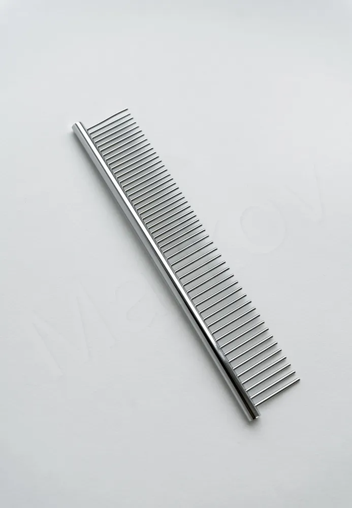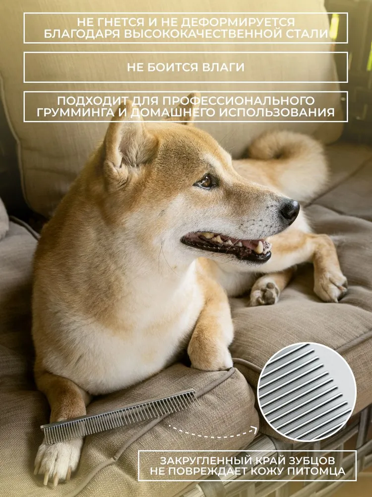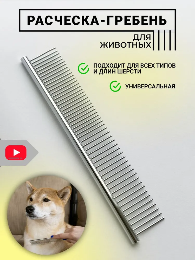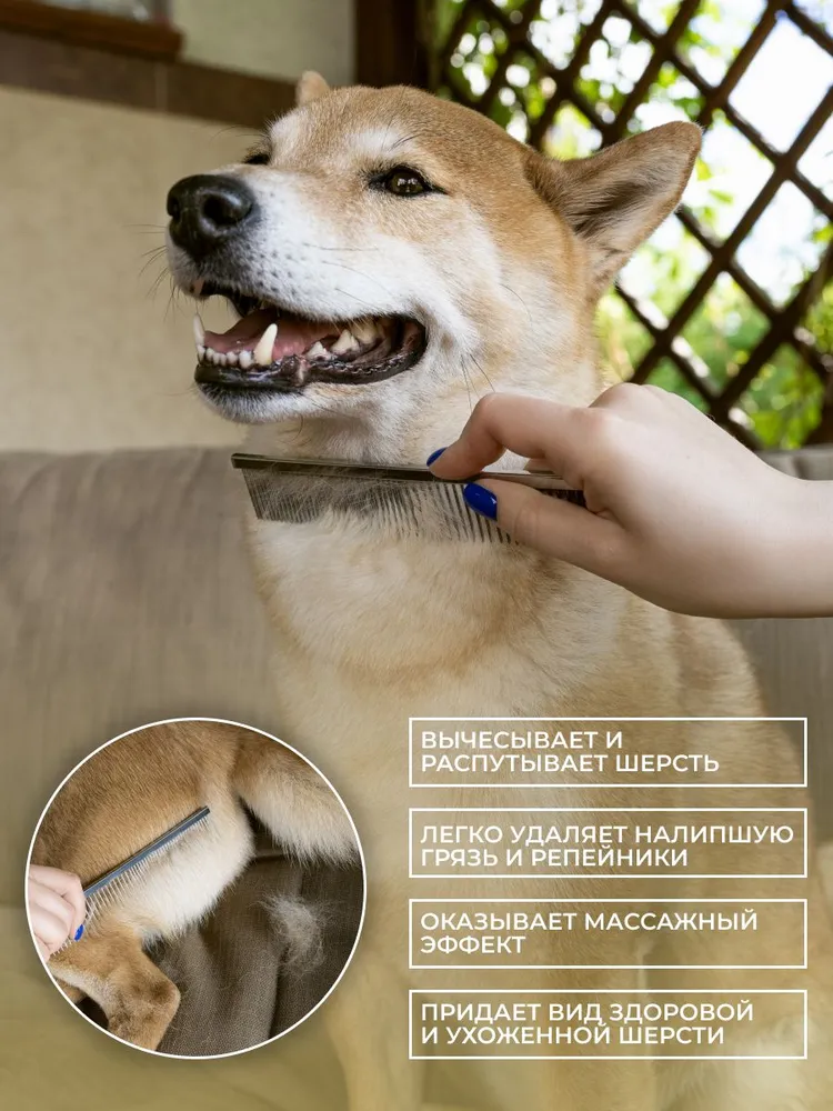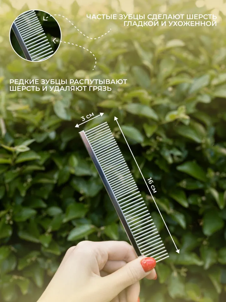 Расческа-гребень для животных предназначена для ухода за шерстью как длинношерстных, так и короткошерстных питомцев. Гребень из нержавеющей стали не рвёт волоски, а плавно и без проблем прочёсывает шерсть животного, удаляя старую шерсть и грязь, способствуя оздоровлению и росту новой шерсти.Закругленные кончики металлических зубцов мягко и бережно воздействуют на кожу животного, а также создают дополнительный массажный эффект.Широкие зубцы помогут легко и безболезненно прочесать спутанную шерсть, предупредив образование колтунов, удалить грязь и репейники. Узкие зубцы помогут расчесать короткую шерсть на голове и лапах, а также привести в порядок всю длину шерсти сделав ее гладкой и ухоженной.Расческа металлическая для собак и кошек очень прочная и долговечная, она не гнется и не деформируется, проста и удобна в использовании. Гребешок чесалка отлично подойдет для повседневного ухода за шерстью вашего домашнего питомца. Подходит для профессионального ухода за всеми видами шерсти. Расческа отлично подойдет в комплекте с дешеддер, пуходерка и колтунорез для кошек и собак.Совет: использование в уходе за животными инструменты для груминга поможет существенно сэкономить ваш бюджет, а также время и силы на уборке.Широкий ассортимент товаров для животных! Всё для пушистых друзей!Когтерезы