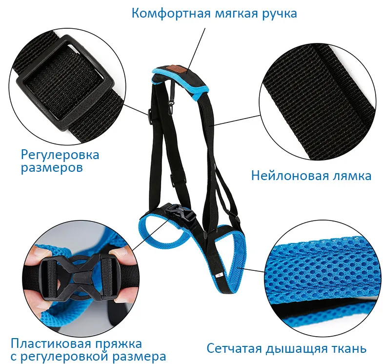 Больше подходит стройным собакам. Переднюю часть после реабилитации можно использовать как шлейку. Для выбора верного размера необходимо измерить грудь и живот.Полная поддержка с плечевой ручкой